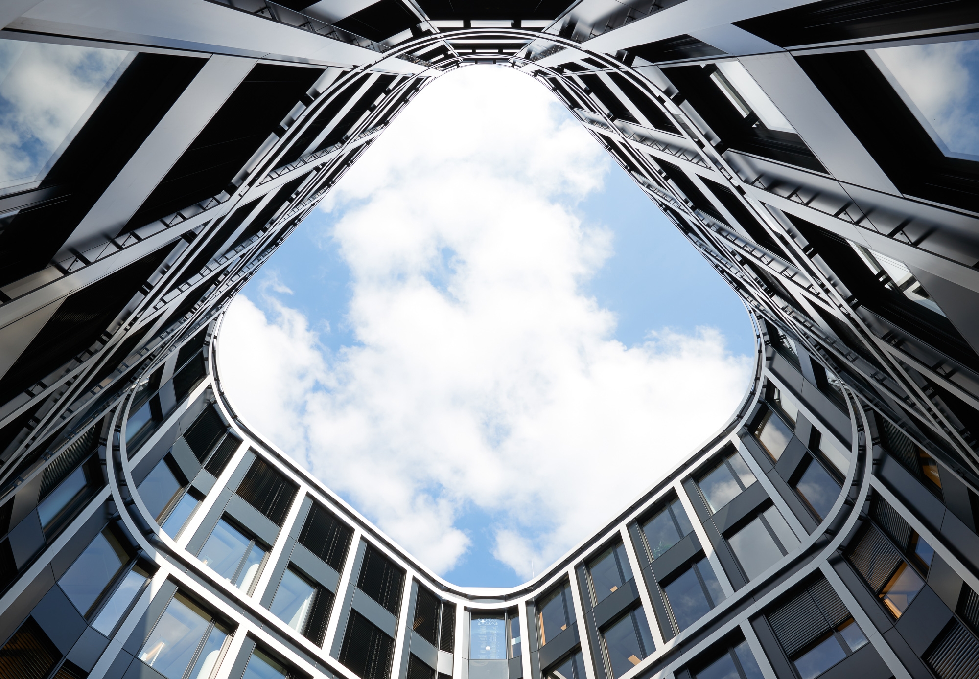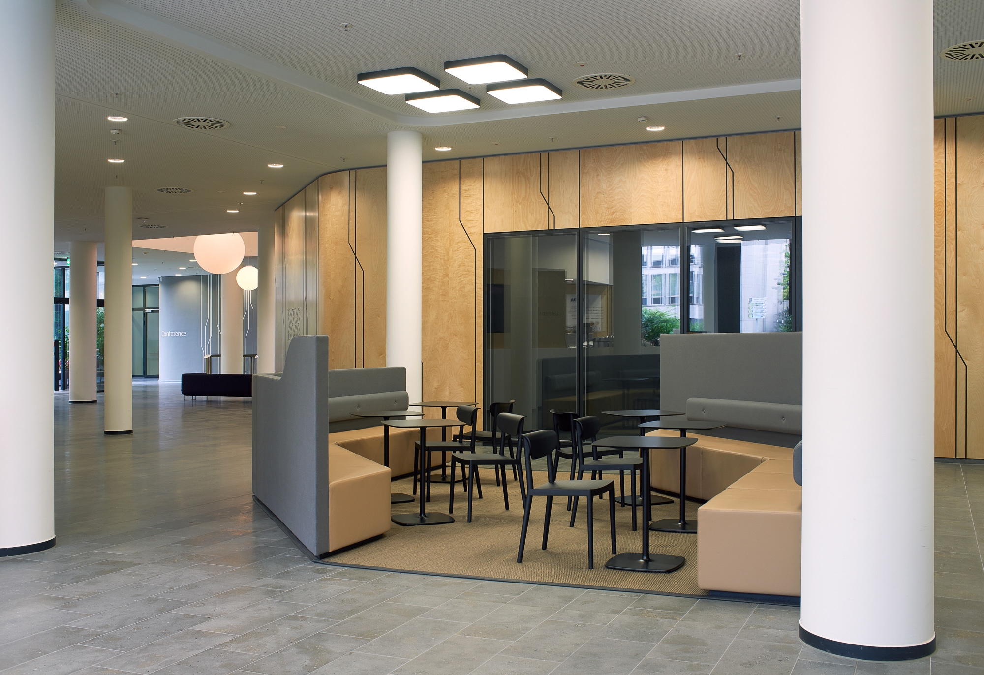 The special shape of the floor plan allows for inner courtyards shielded from traffic noise and flexible use of space. The connecting foyer on the ground floor provides employees with direct access to the two cores equipped with elevators and stairs. In addition, the conference rooms and the company restaurant were arranged here.