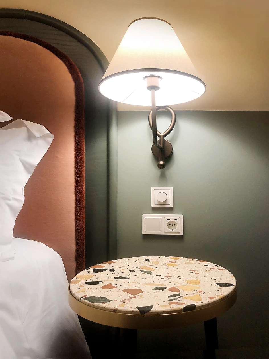 Ennismore’s inhouse design studio, AIME Studios, is responsible for the interiors, which are connected by a carefully constructed narrative built around rough nouveau, a concept which draws inspiration from both the theatricality of Charlottenburg’s golden era and the raw materiality of Brutalism. The aesthetics are layered and textural – unrefined plaster walls provide the backdrop to ornate Art Deco light fittings and vintage furnishings, and striking, industrial materials are used in juxtaposition with exaggerated cornicing and emerald-green tiles. A curated collection of locally sourced and commissioned artwork includes a bespoke abstract mural by Berlin-based artist Stefanie Kägi, which dominates one wall of the lobby and nods to the jerky, dancelike figuration of German Expressionism.