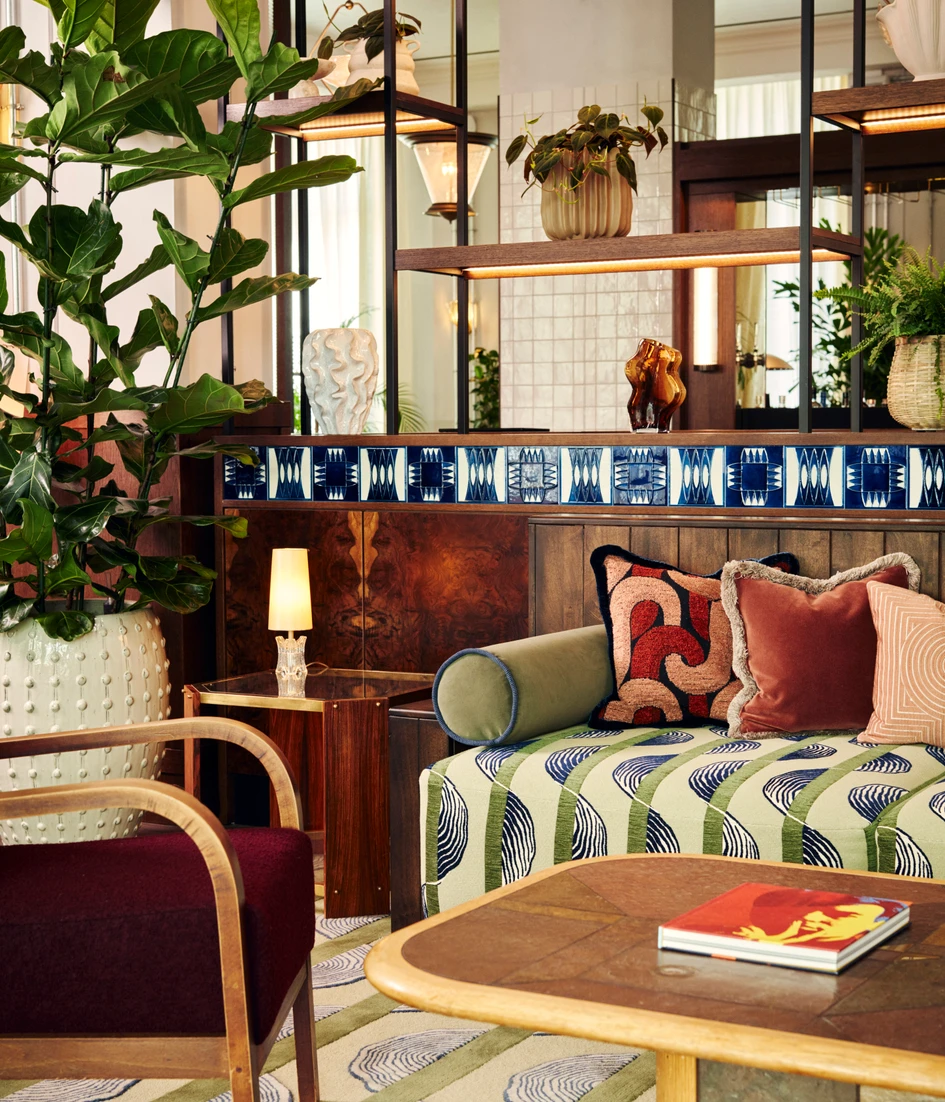 Blue and green tones inform the colour palette of the bright and airy lobby, which is dotted with mid-century furniture sourced from Northern Europe, bespoke rugs, and referential Bauhaus artwork. Upon entry, guests are greeted with clusters of Art Nouveau-inspired sofas, armchairs and tables set under striking Murano glass chandeliers that provide charming spots to work, meet or grab a bite from the lobby menu of Hox favourites. A central wraparound bar leads to an intimate Winter Garden, the perfect spot to pull up a bar stool for post-work cocktails or cosy down next to the Delft-inspired tiled fireplace for a quick snifter as the evenings draw in.