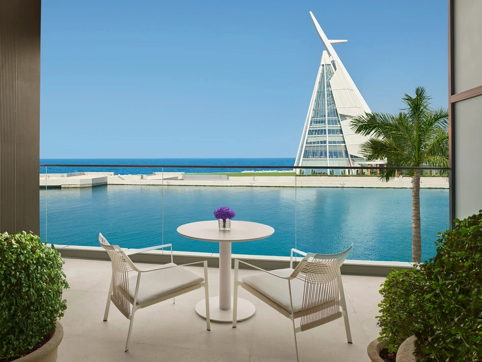 Diseñado por el arquitecto francés Xavier Cartron, los cinco pisos con terrazas del hotel albergan majestuosos espacios públicos de techos altos, 52 habitaciones y 11 suites, cada una con impresionantes vistas al Mar Rojo, la Corniche, el club Nautico y la pista de F1. Cada rincón interior y exterior está impregnado de elegancia y confort del estudio de diseño canadiense Yabu Pushelberg.