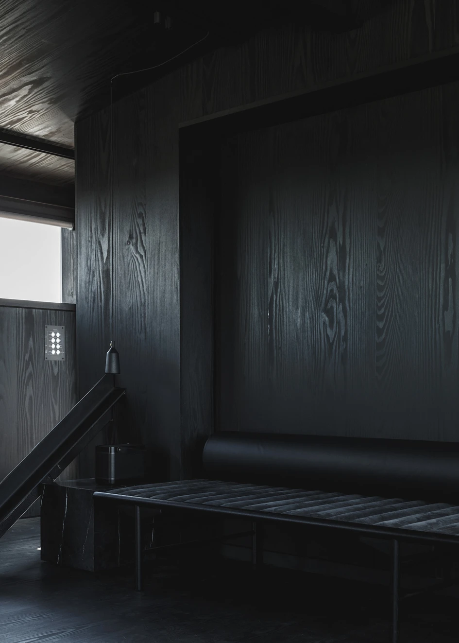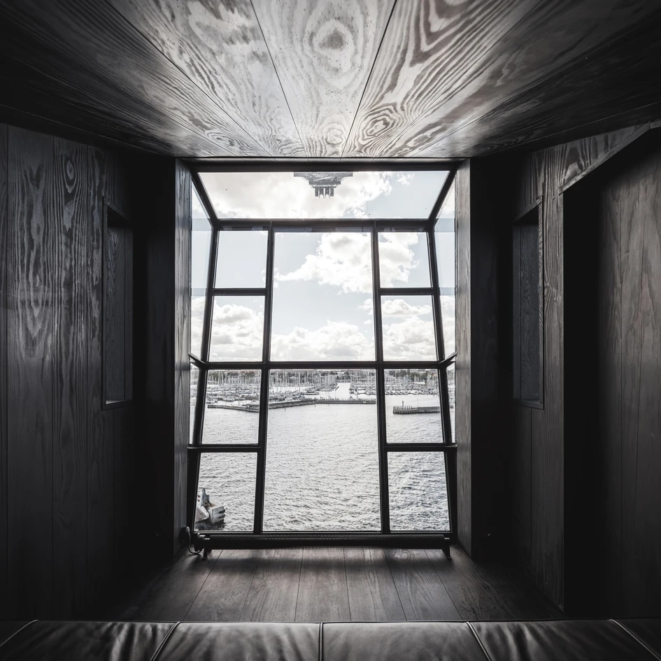 En el interior prevalecen sobre todo los tonos muy oscuros en honor a su pasado como grúa de carbón. Los espacios se mantienen en un negro noble y en gris oscuro, que gracias a sus amplios ventanales no suscitan en ningún momento sensación de estrechez sino de relajación. Los materiales naturales como el cuero, la madera, la piedra y el acero complementan el interior, pero de manera muy contenida ya que los arquitectos ponen un énfasis especial en el minimalismo. “El color negro juega un papel importante en la minimización de las distracciones visuales. Nosotros, los humanos, tenemos la sensación de calma dentro de espacios oscuros, donde nos sentimos arropados” comenta el arquitecto principal Mad Møller de Arcgency.
