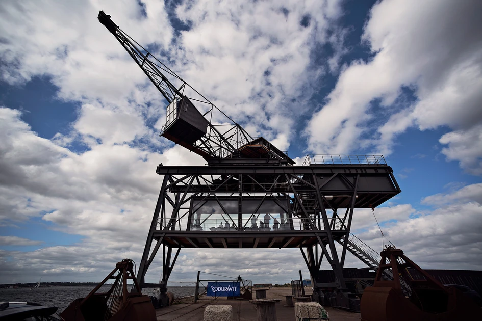 El propietario de „The Krane“ Klaus Kastbjerg, responsable de diferentes proyectos en la nueva Waterfront de Copenhague, quedó inmediatamente seducido por la vista excepcional hacia el mar que ofrecía la grúa de 50 m de altura, y se ocupó de transformar esta antigua máquina industrial en algo contemporáneo con alma propia. A la planta baja se accede a través del puente levadizo, que es como una escalera que llega hasta el paseo marítimo. En una sala de estar ubicada en la primera planta y justo en la parte superior se encuentra la zona de Spa que incluye las icónicas bañeras Cape Cod de Duravit y Philippe Starck. El Spa está revestido de piedra gris desde el suelo hasta el techo y durante el baño en la Cape Cod se puede disfrutar de una vista al mar a través de un amplio frontal acristalado. En la tercera planta pernoctan los huéspedes. En los baños se encuentran más diseños de Duravit: inodoros ME by Starck y lavabos Architec proporcionan el correspondiente confort. Cada zona del "The Krane" puede ser alquilada de forma independiente.