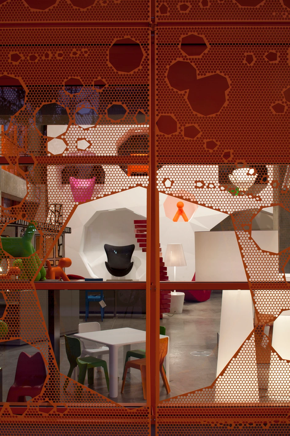 JAKOB + MACFARLANE decided to take the language of the Cube, which is based on the fluid movement of the River Saône and in a sense project this movement inside the space of the showroom. Thus imagining the space as an extrapolation of the façade, a virtual three dimensional river or volume containing a long porous wall whose 60 “alvéoles” are filled with furniture. This wall wraps around the space of the showroom forming an L. The spectator moves from the spectacular entry wall towards more intimate spaces on the river side. Each “alvéole” is unique in seize and form allowing thus an intimate and private view of each design piece.