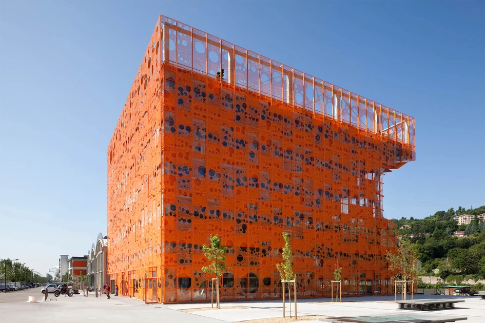 The cube, next to the existing hall (the Salins building, made from three archs) highlights its autonomy. It is designed on a regular framework (29 x 33m) made of concrete pillars on 5 levels. A light façade, with seemingly random openings is completed by another façade, pierced with pixilated patterns that accompany the movement of the river. The orange color refers to lead paint, an industrial color often used for harbor zones.
