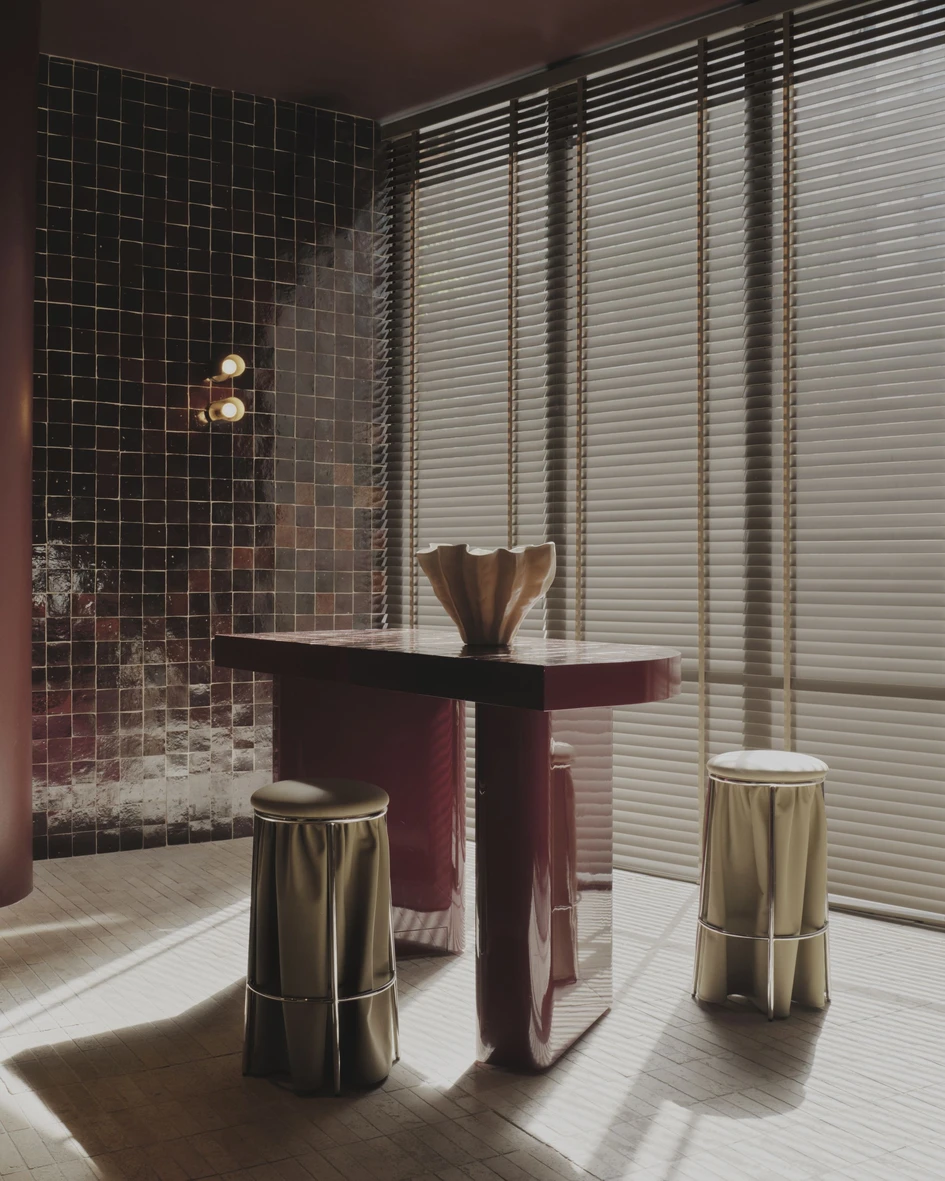 Its adjacent sibling, bar tilda, offers an elegant cocktail bar experience for hotel guests and locals, from morning till late nights. This all-day and late-night service heavily influenced the material palette, balancing light, textured fabrics against the backdrop of deep burgundy hues, creates a versatile ambience that can shift from light-filled days to intimate and moody evenings. A nostalgic setting for cocktail enthusiasts, bar tilda features an elaborate whisky collection displayed in an armoire-inspired cabinet referencing the mid-century design heritage of the hotel. Dramatic drapery to the host desk and timber venetian blinds along the street-facing windows were added to pique the interest of passers-by.