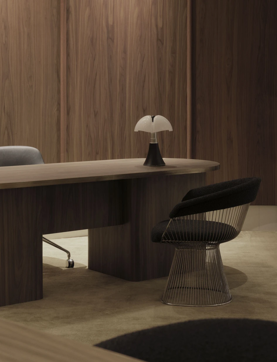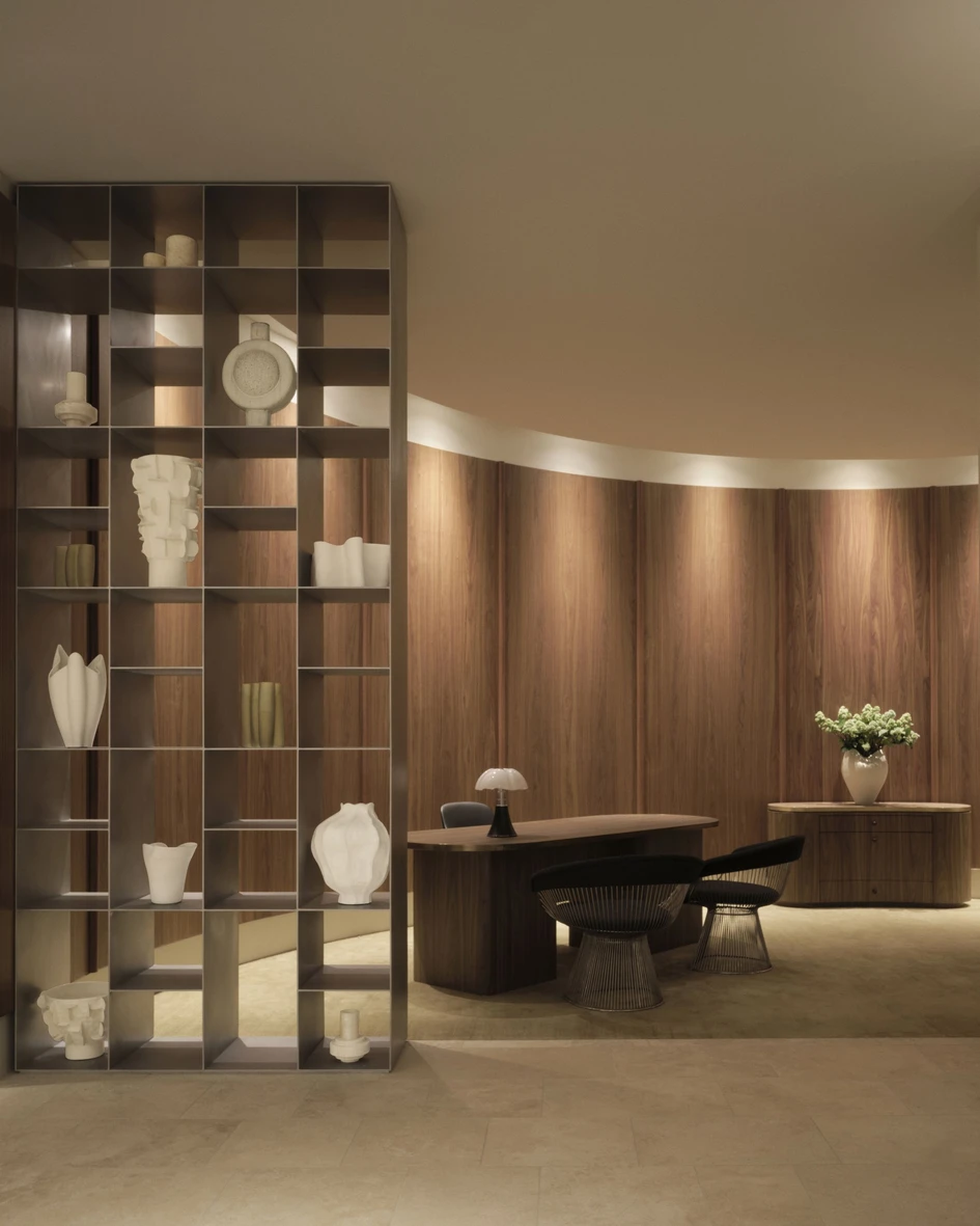 A reflective lift with chrome panelling was preserved and enhanced at ground level, replacing the original combination of chrome and timber with a fully metallic finish to create an engaging interplay with lighting through its mirror-like surface.