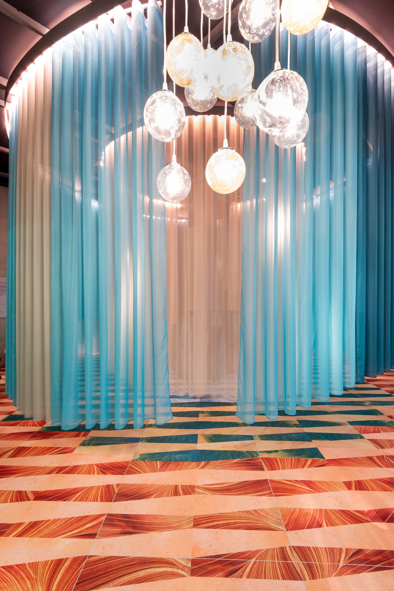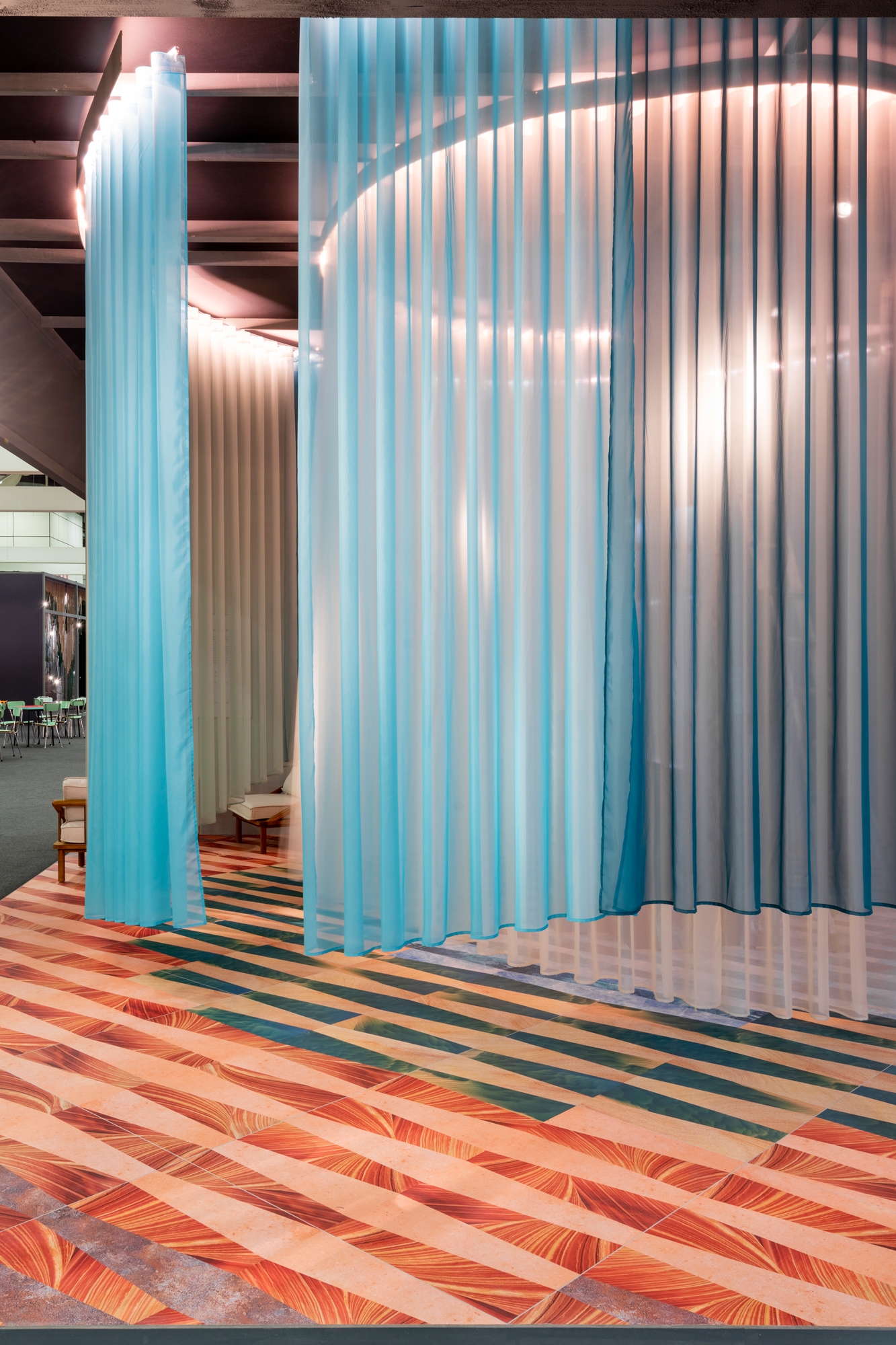 Faro Barcelona provided the fans positioned in the centre of the installation that recreate the effect of moving water, and finally, Jannelli & Volpi produced the wallpaper that was designed by THDP and inspired by natural textures. A yoga for the mind that takes visitors to a parallel dimension.