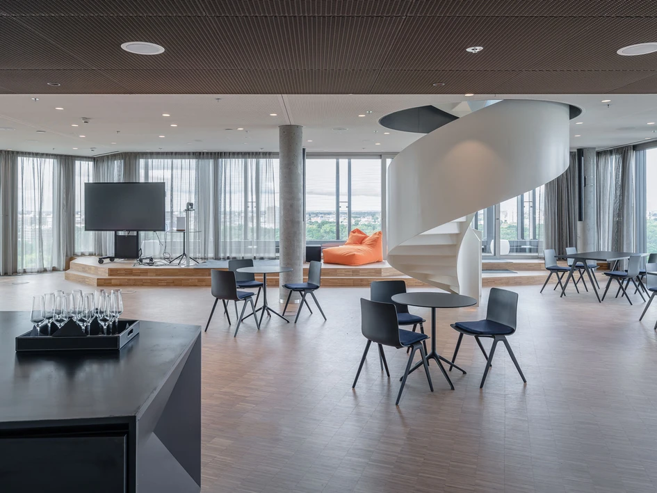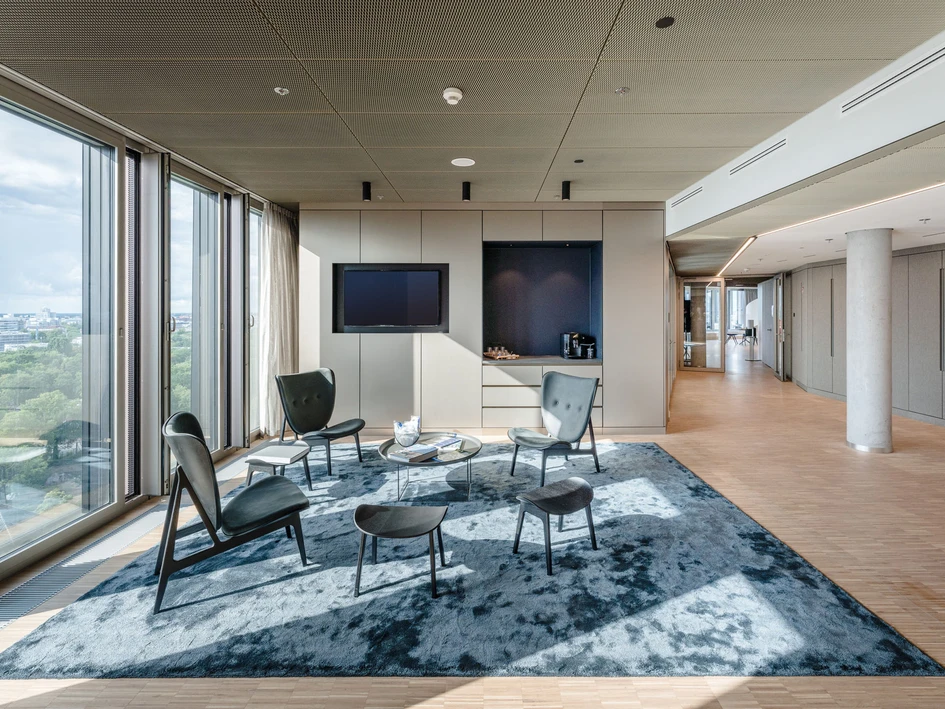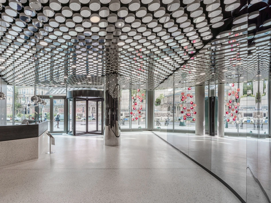 Round ceiling elements define the style of the elevator lobbies on all floors. As a special highlight, the elements in the foyer have a mirror-finish on the visible side that constantly redefines the space.