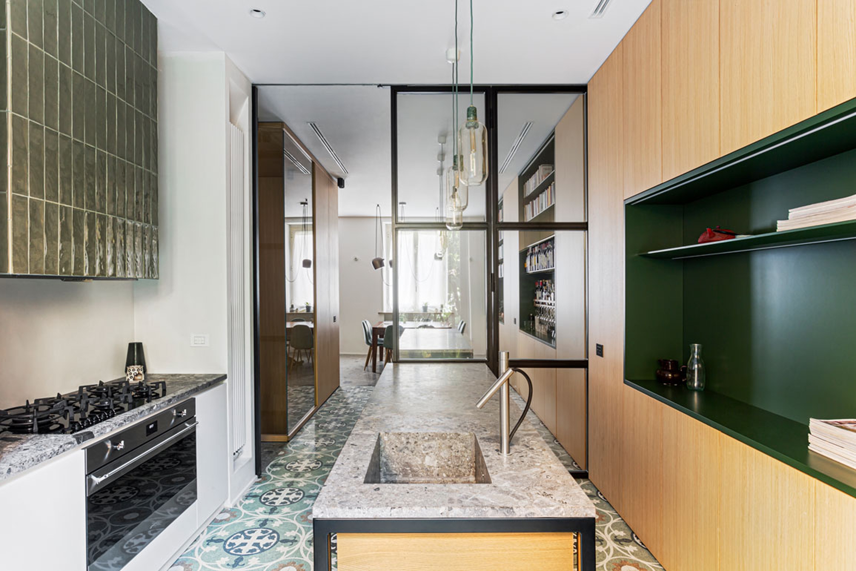El piso interior, con la excepción del área de la cocina, definida por azulejos arabescos, está completamente compuesto de grandes losas de hermoso ceppo di grè.