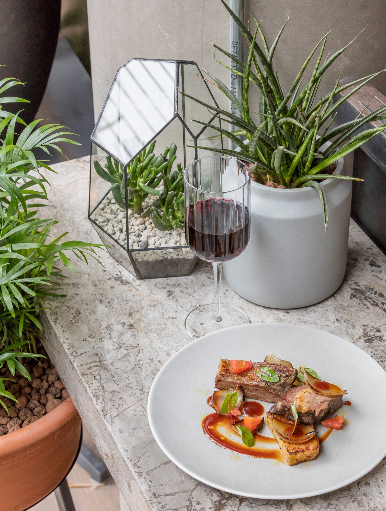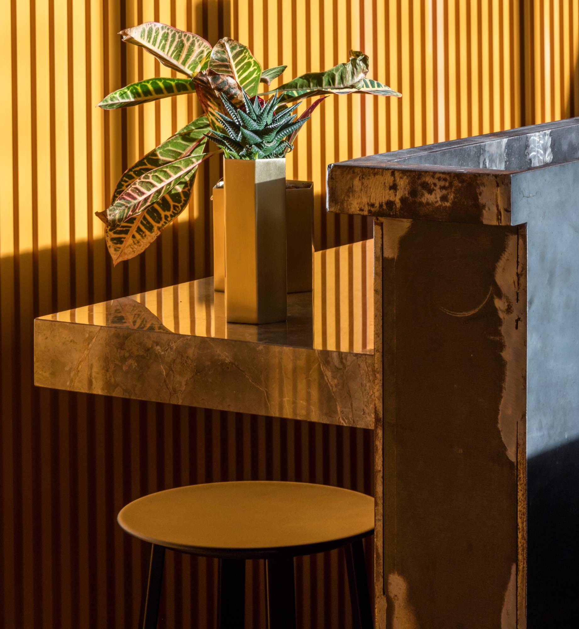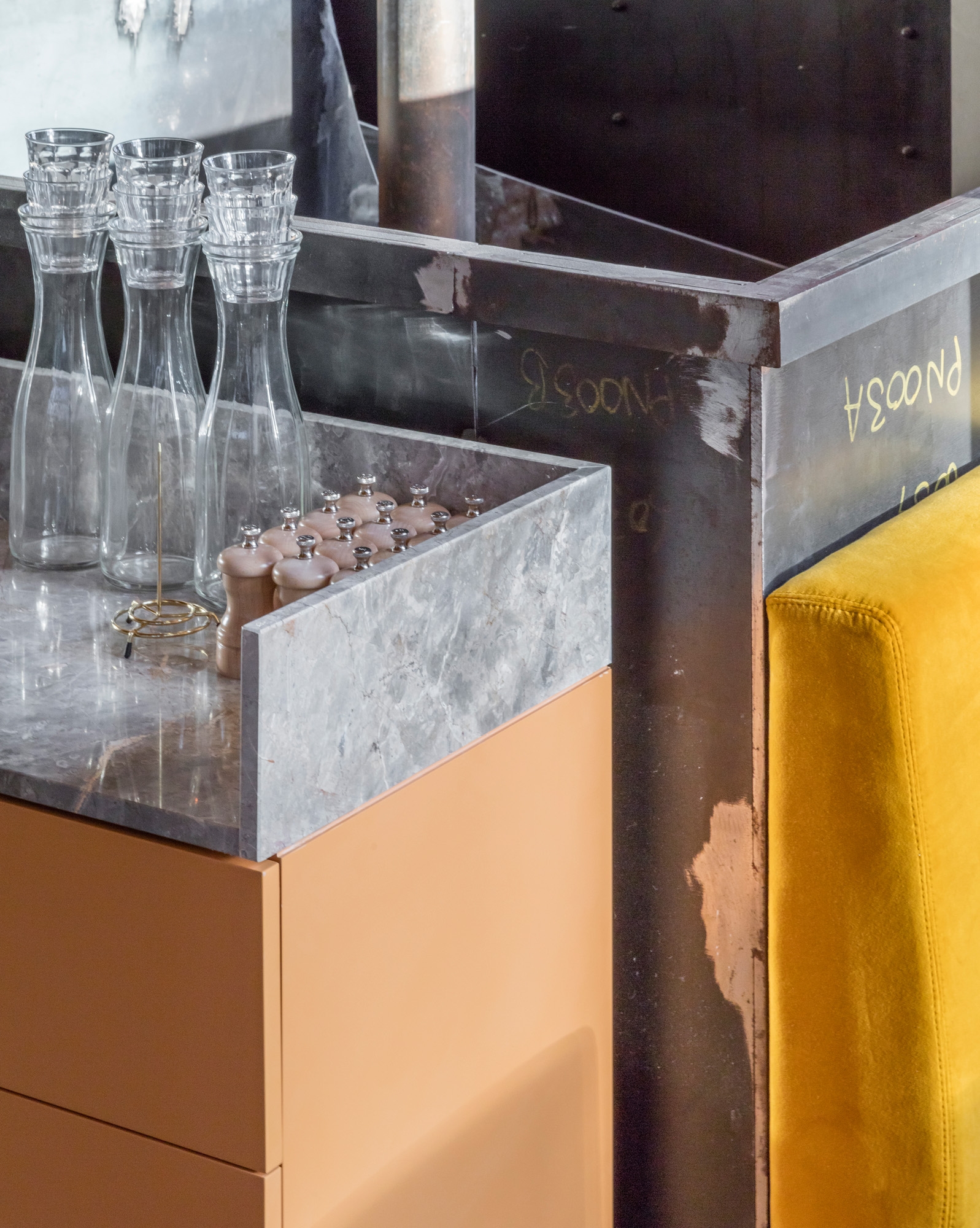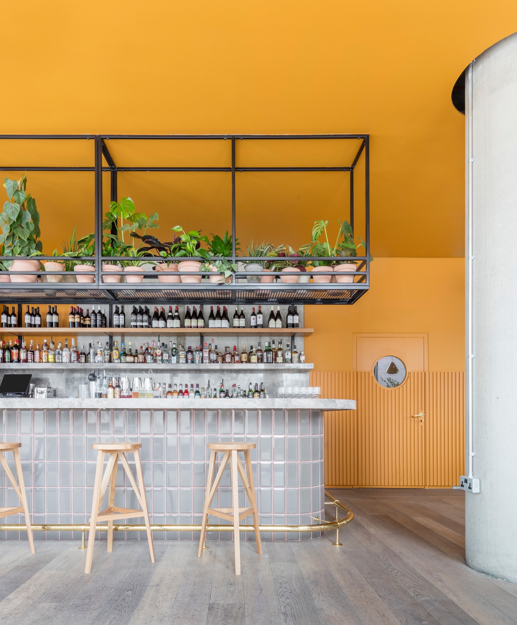 The space is heavily glazed and washed in sunlight throughout the day so we were conscious of creating texture and relief in many of the surfaces while mixing materials with a sheen or luster and those that were soft and matte to augment the kinetic quality of the light while providing comfort. We designed the restaurant to be as warm, welcoming and happy (and even appetizing) at night as it is during the day, and created the joinery and furnishings to look better with some wear and tear after heavy use. Natural stone, ceramic, brass, timber, concrete and blackened steel feature heavily in a bold but limited palette and we designed in a lot of room to accommodate generous amounts of vegetation in aged terra cotta.