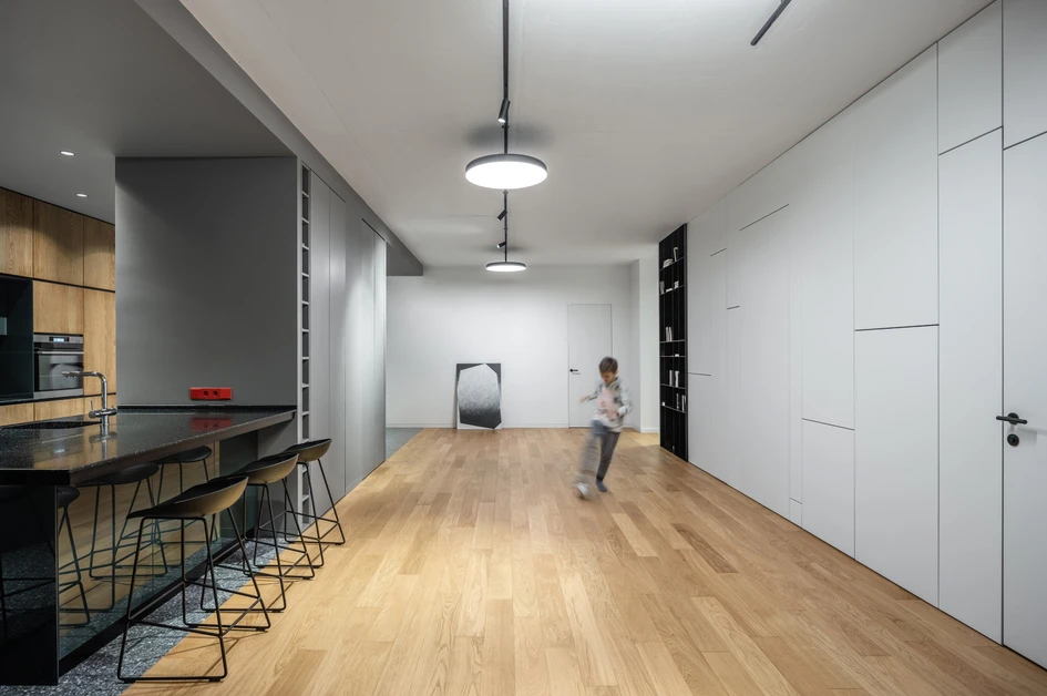 The apartment space consists of two united flats. A huge hall appeared as the result of it. After careful consideration we took a decision to preserve this vast space and not divide it into smaller rooms. “Here my children will be playing soccer and riding scooters”, – the owner expressed his wish and this idea was totally supported by our team.
