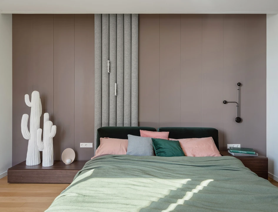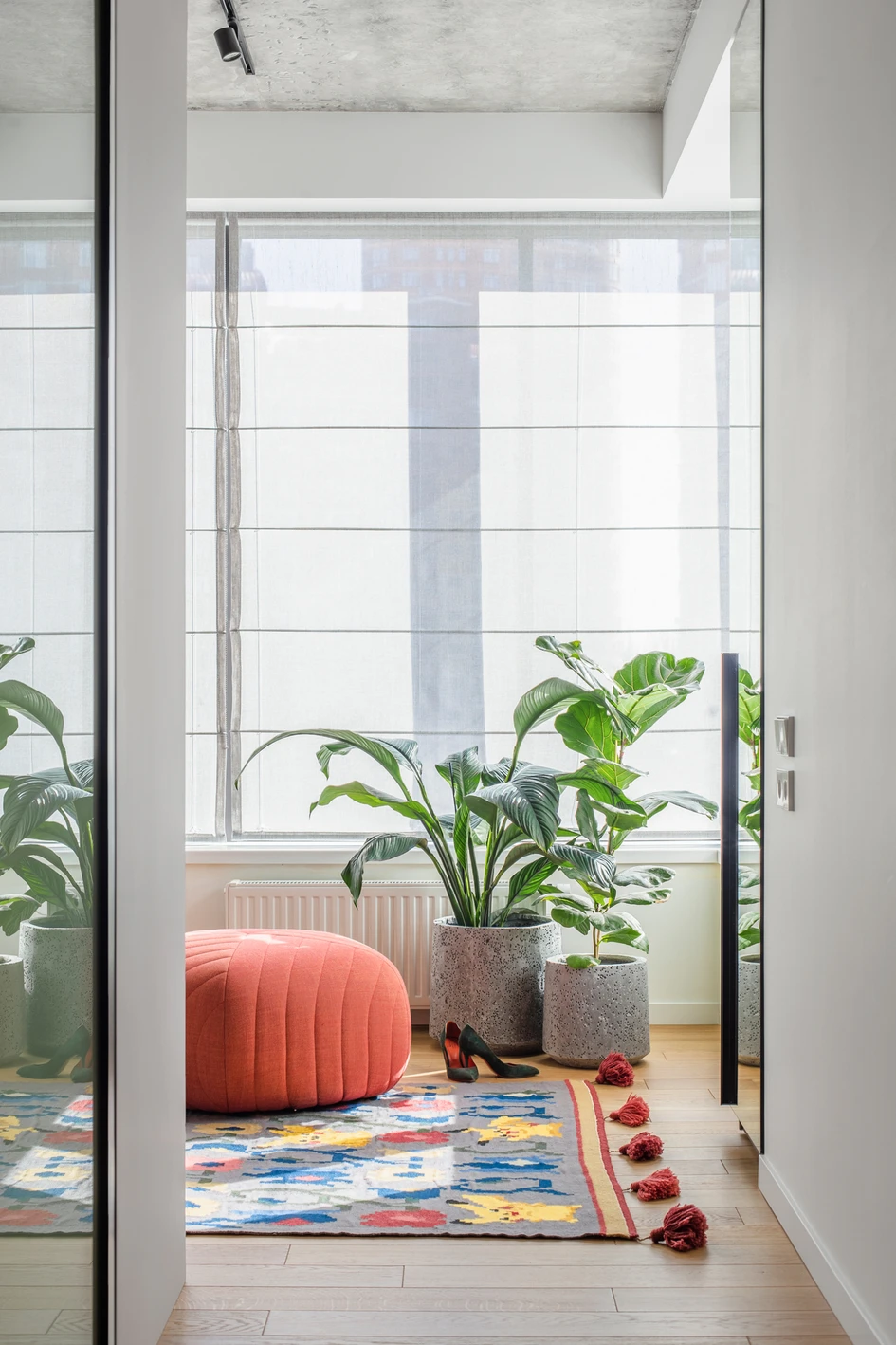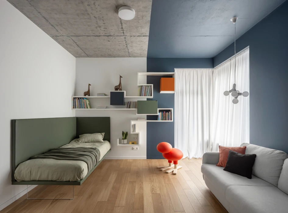 Kid’s zone comprises of two rooms for boys with a shared bathroom and a room for the young lady in powder-pink tones with her own bathroom. This zone can easily be identified there are three bright doors tinted in fashionable shades of green, blue and terracotta. A minimum of furniture and more functional design – this is the prevailing idea of the whole space.