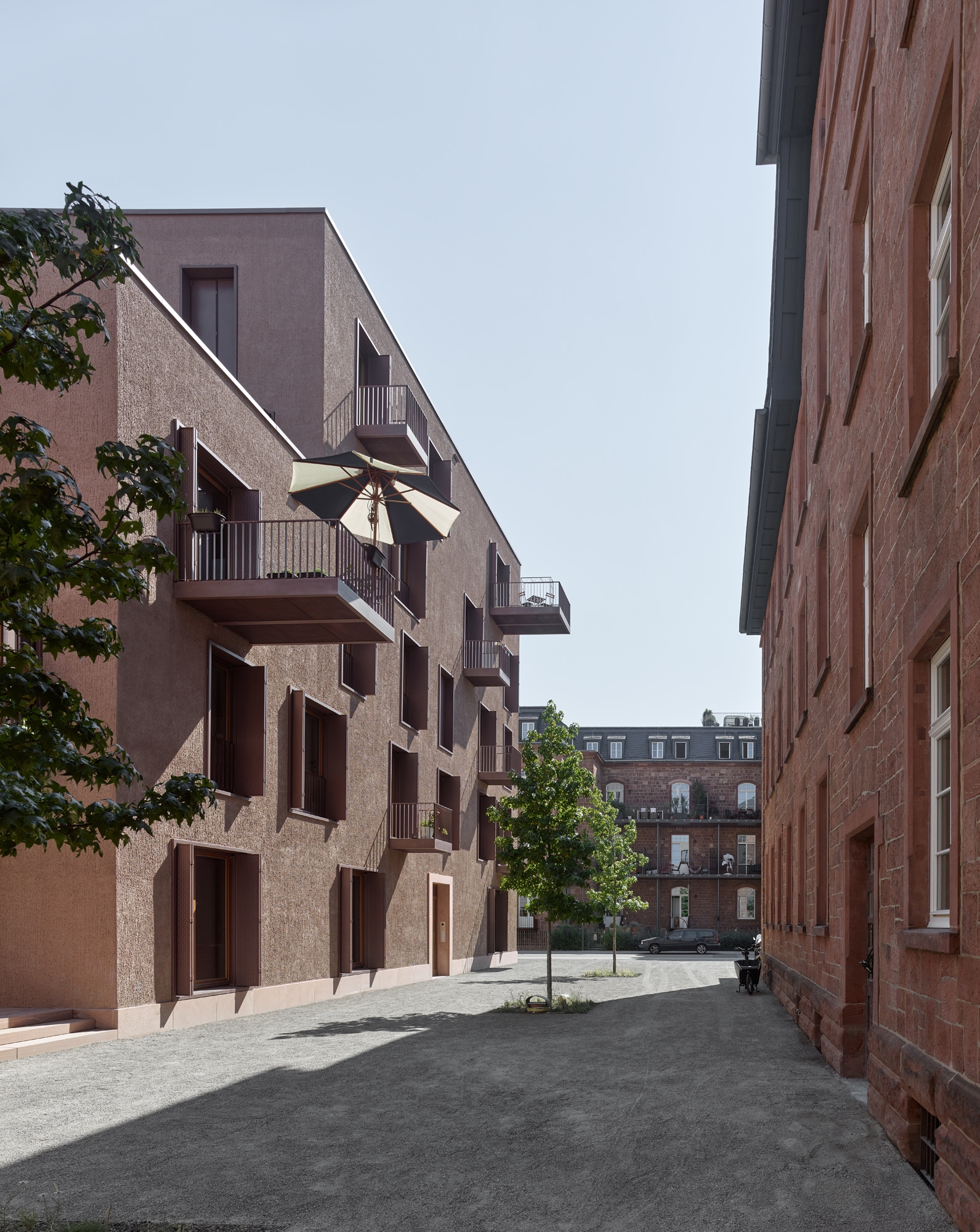 The choice of materials and coloration prioritizes the harmonization of the old and new architecture. Accordingly, a special focus is the elaboration of details. A finely wrought plinth in red polished hard sandstone from the Neckar Valley region takes up the regional stone of the old barracks building. It leads into the central district square, which is laid out at the same level and paved in the same stone. The coarse exterior plastering of the facades is derived chromatically from the sandstone. As uniform steel elements, the unbroken surrounds and folding shutters of the window openings configured freely within the facades, make a thoughtful contrast. Depending upon the spatial situation, they are given balconies having divergent sizes, each in the same steel. The perforated window shutters of the communal apartments advertise the building’s utilization, even in darkness.