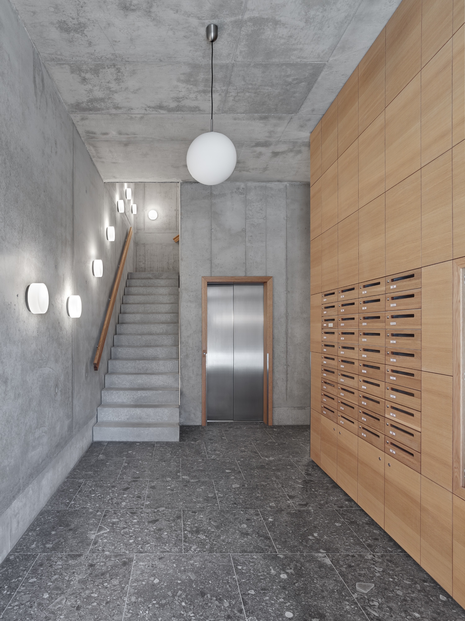 The renunciation of insulating materials means that these buildings are restricted to a few simple materials: plastered brick, loadbearing reinforced concrete, wood, and steel. With their solid masonry walls in Poroton brick, the architecture relies upon a construction method that, while traditional, has a promising future as well, and functions energetically without additional insulation (KfW Efficiency House 55). The loadbearing core and reinforced concrete floor slabs remain visible throughout the interior spaces, creating contrast within the apartments with the herringbone parquet, wooden windows, and smooth plastered brick walls.