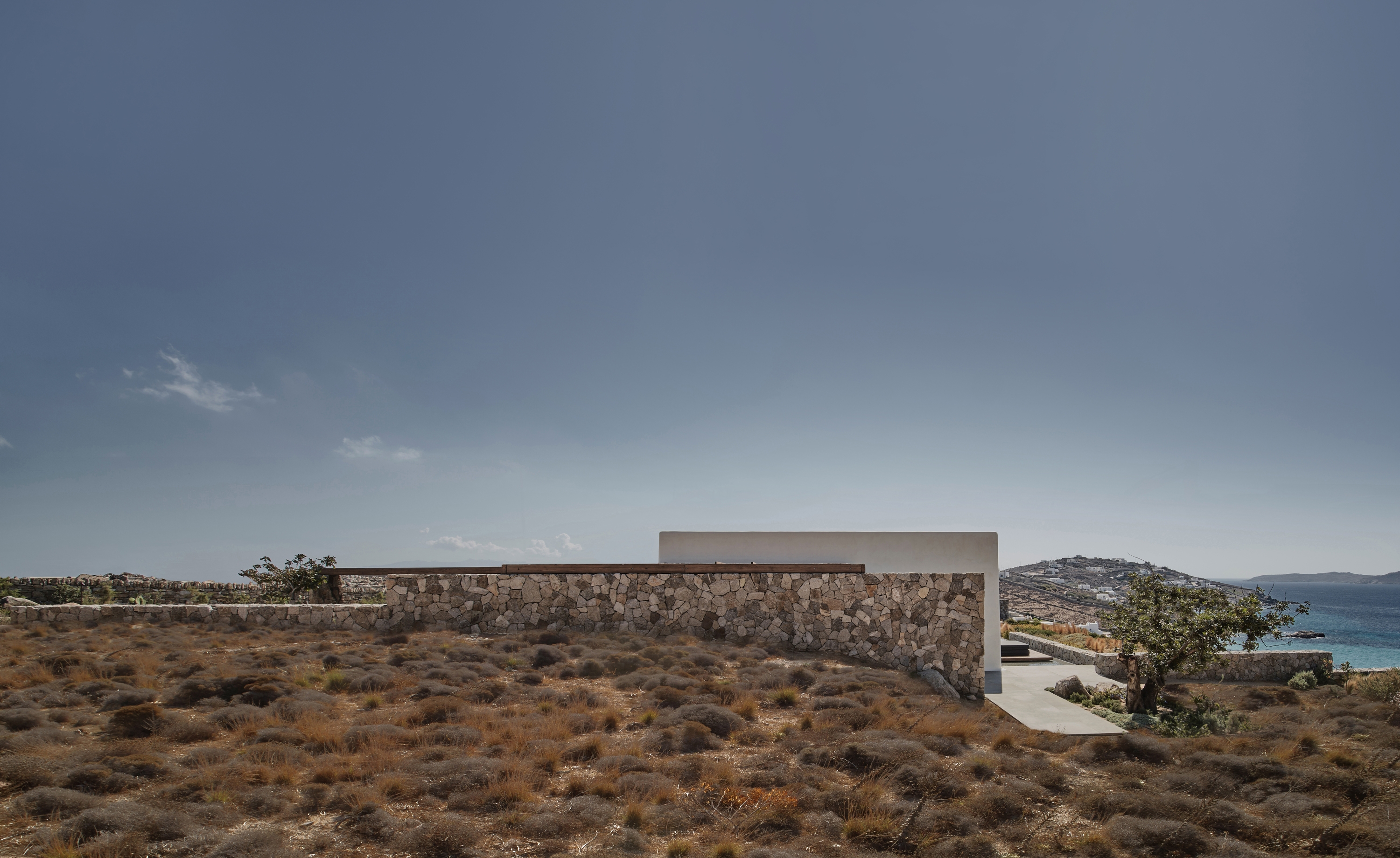 Sitting on the ridge of the hill of Aleomandra in Mykonos yet almost entirely hidden from view, Villa Mandra looks straight out to sea and the sunset over the neighbouring island of Delos. A 6-bedroom holiday house built for a young, dynamic couple to enjoy with their family and friends, it celebrates its spectacular view from a grounded viewpoint blended into a sensitively landscaped, stone-walled garden that screens it from the road behind.