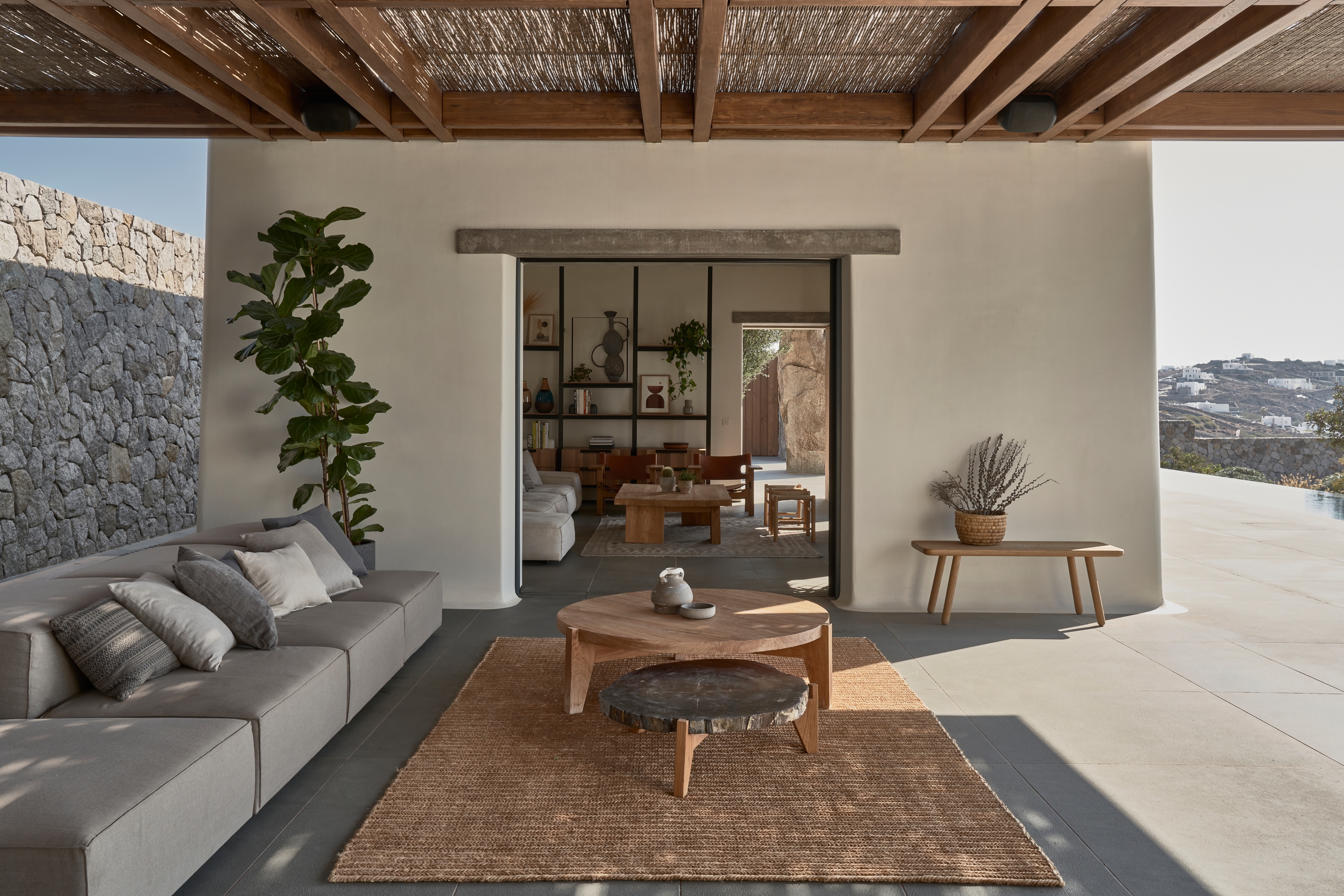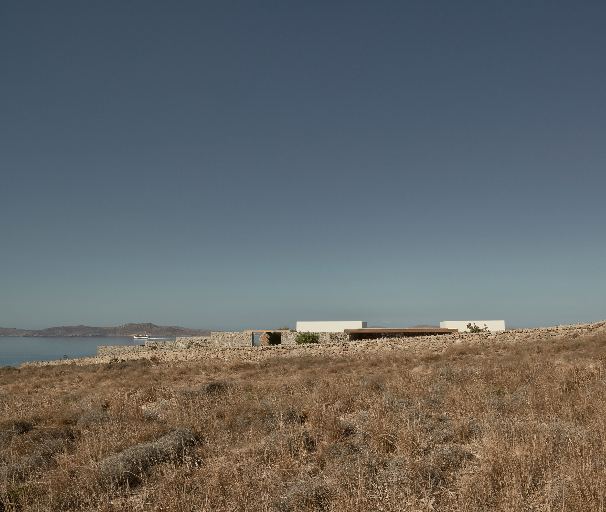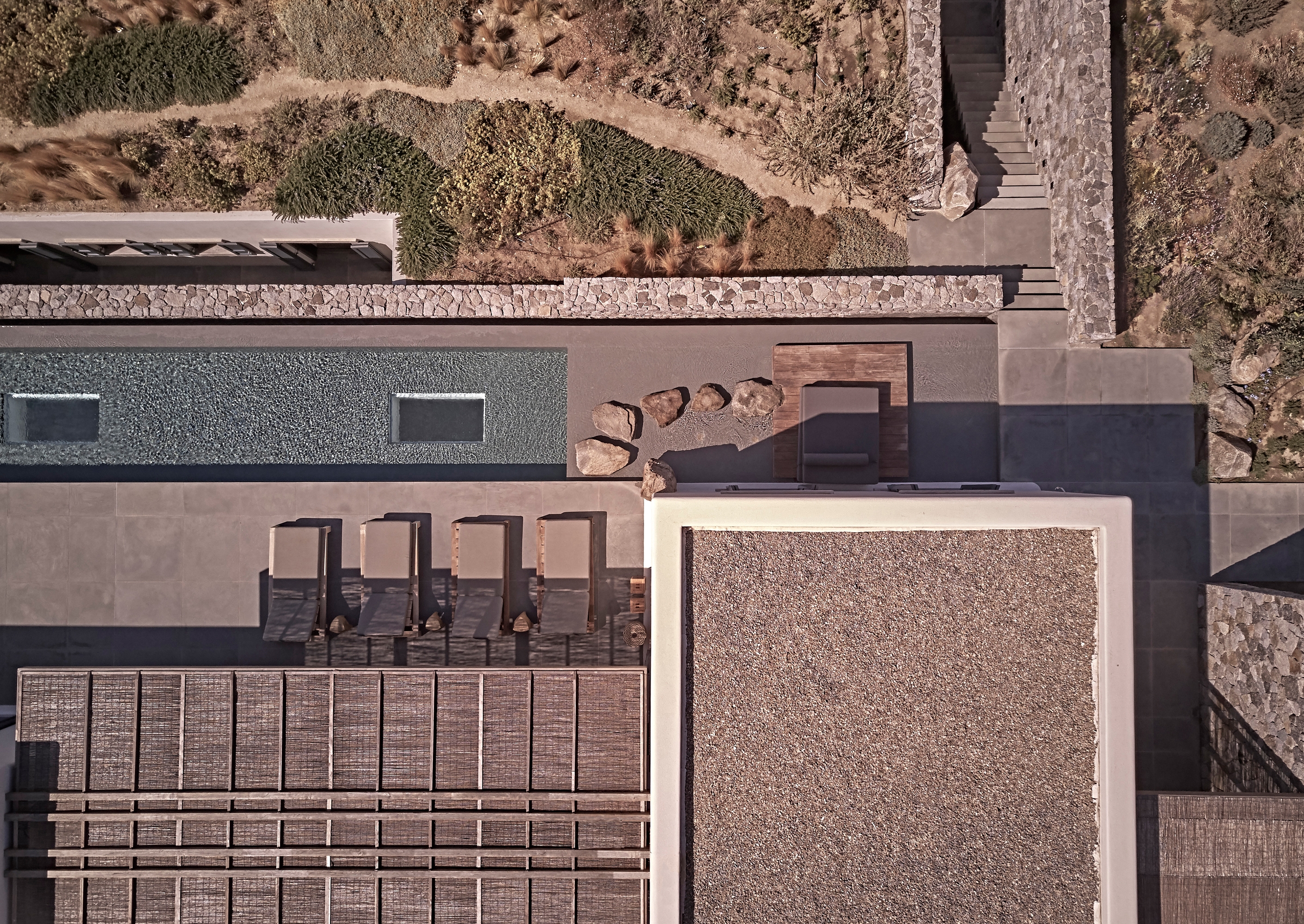 The simple white volumes, straight stone walls and light pergola planes sit comfortably in the Cycladic landscape and the efficiency of their layout, centred around the courtyard living space, streamlines daily life. Villa Mandra is informed by humble Cycladic tradition, enriched by natural materiality and inspired by contemporary summer living.