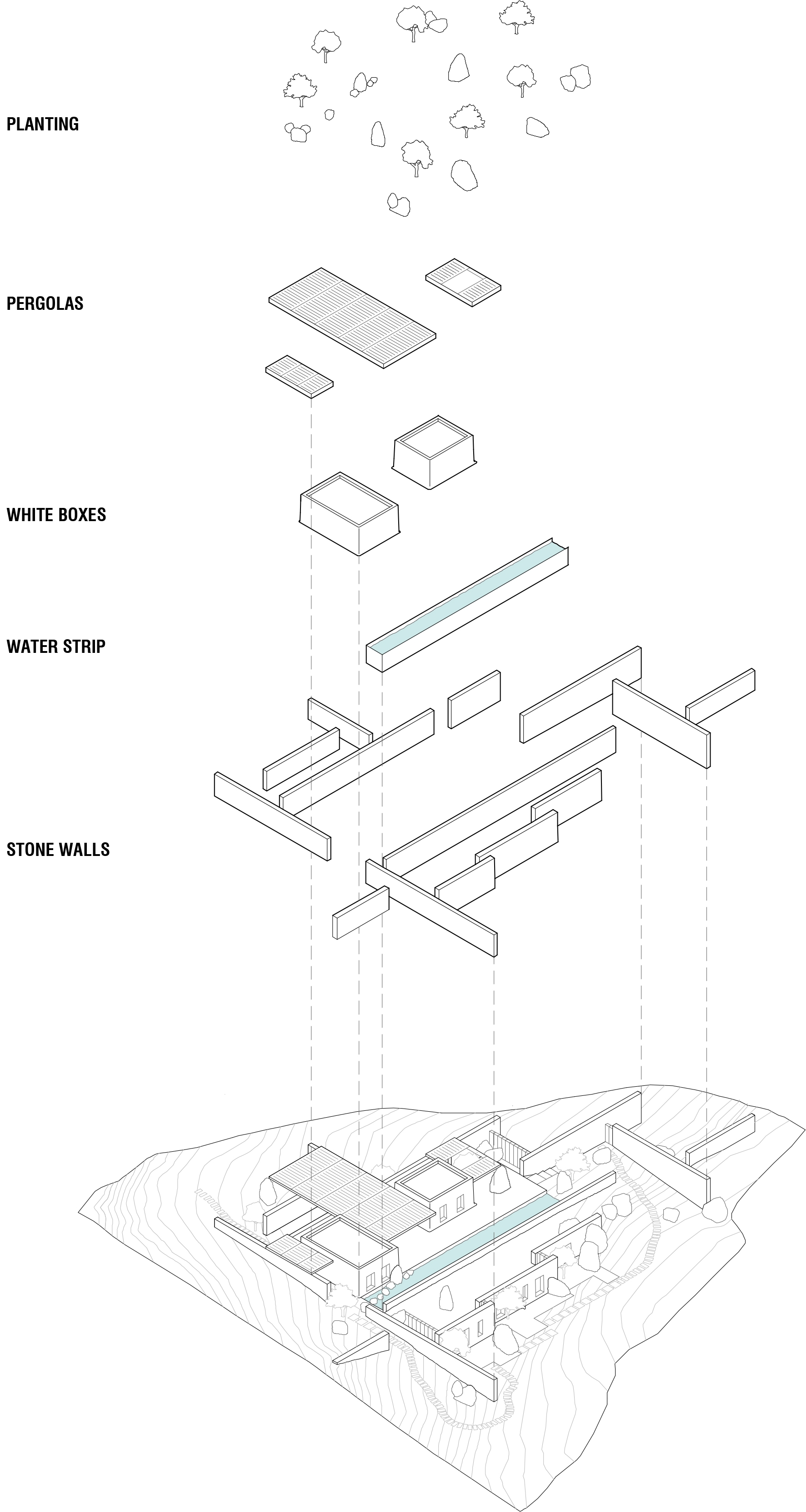 Key to the character of the house is the palette of traditional materials such as lime-wash, stone and wood that have been applied and engineered with contemporary techniques to create un-nostalgic architecture that bridges heritage and locality with contemporary life. Hand-built stone walls are sharply confident; traditionally rendered, round-edged volumes are perfectly flat and smooth. The customary chestnut pergola has been engineered to increase its structural integrity, to form a glue-lam beam lattice that sits lightly on the white volumes, shading and protecting the extensive courtyard beneath.