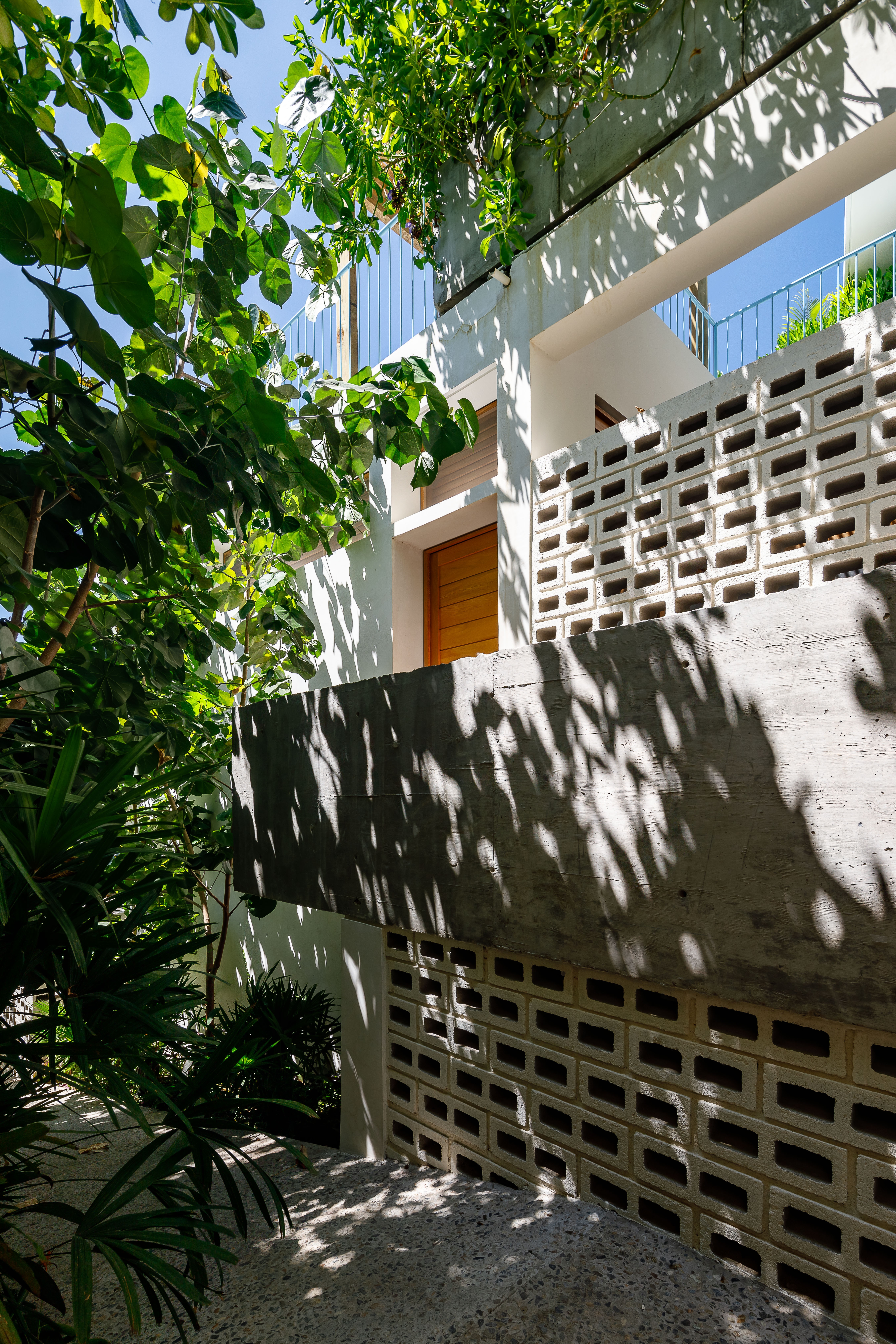 The apartments are accessed through a system of natural pathways and two gardens that replicate the natural slope of the terrain and stretch down to the sea. The ocean breeze, in synergy with the shade provided by cantilevered roofs and the cross ventilation generated by the terrace and the lateral walls, provides passive cooling options.