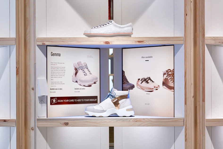 The structure provides a surface area for multimedia brand messages as well as the presentation of merchandise. At the same time, it serves as storage space and allows the integration of a welcome desk and seating. The continuous horizontal shelving traces the organically shaped contours of the floor plan. The zig-zag configuration of the vertical panels, in turn, determines the shape of the individual compartments and makes it possible to utilise both sides of the shelving wall. Narrow gaps between the vertical elements give the construction a certain lightness and create a visual connection between the spatial zones. In addition, these panels provide surfaces for digital displays, photographic prints, graphics and texts as well as colour fields, enhancing the atmosphere of the space and defining the various zones. Vizona is responsible for the complete project coordination and implementation of the Vitra & Camper project.
