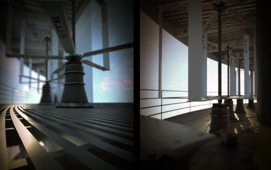 Las turbinas eólicas de eje vertical se disponen en las zonas curvas que unen los núcleos de comunicación. Tanto los aerogeneradores como los ascensores panorámicos están cubiertos por una envolvente metálica calada que, siendo permeable para el viento y las vistas, confiere a la estructura un aspecto monolítico. La construcción se realiza de una forma evidente y sencilla, gracias a la velocidad de los encofrados trepadores que permiten materializar el edificio como icono.