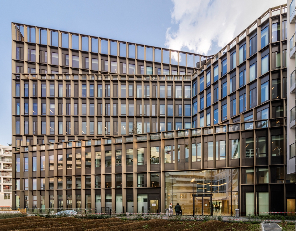Boursorama Banque has moved into its new Parisian head office in Boulogne-Billancourt designed by Studioninedots. In collaboration with Ateliers 115, Studioninedots created a robust and clear building distinguished by its subtle recesses and terraces but foremost by the striking facade that interplays rhythms of bronze-coloured blades. The bank building is situated on a section of the old Renault factory site in Paris. The plot Lot YA sits within a dense urban fabric and points with its southern tip towards the adjacent Parc Billancourt and the river Seine. This resulted in a paradox: optimal views of the park were desired but, simultaneously, incoming direct sunlight should be blocked.