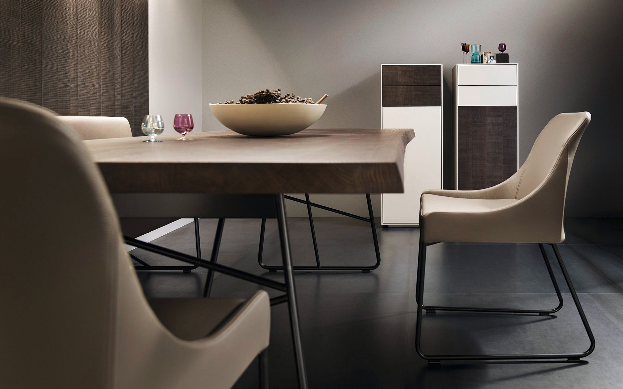 The new model Youma ideal for long evenings at the dining table. But even in hotel lobbies and fine dining makes the trendy seating with the strikingly flared legs a good figure and helps ensure that our guests feel at ease. For Youma KFF offers a wide selection of fine leather covers. For the legs, there are two variants. In addition to the conventional metal frame of the chair is also available with four-legged frame in natural wood. Youma was developed by KFF together with the German designer Sven Dogs. Besides furniture designs the all-rounder also lamps, tableware, packaging and luxury suites for cruise ships.