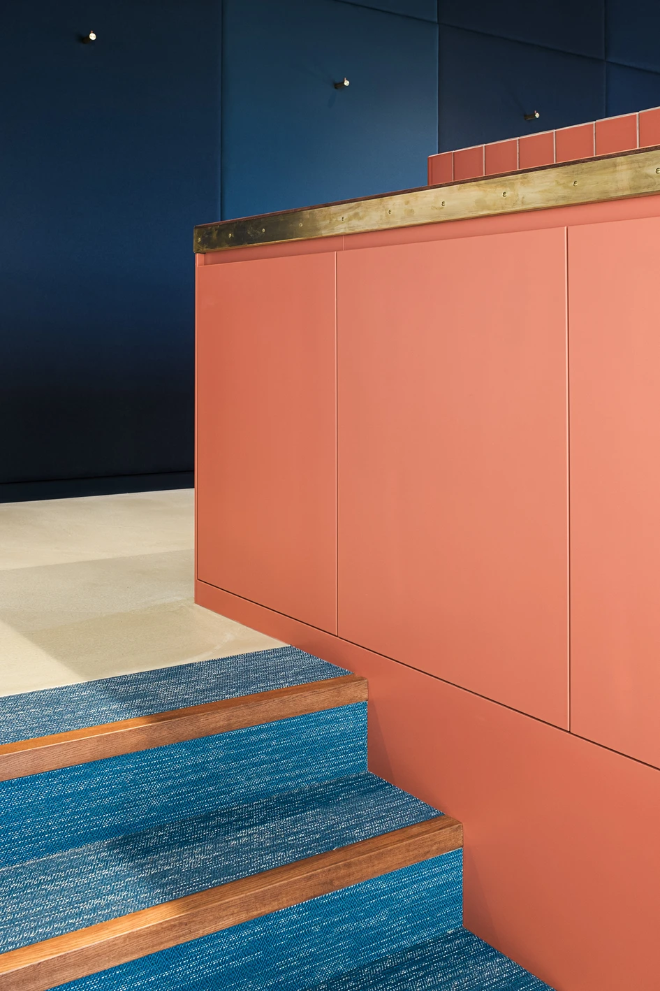 The choice of materials and contrasting colors is as diverse as the different scenarios, ranging from concrete flooring to glazed tiles, dark stained timber, patterned woven vinyl flooring, upholstered panels and handmade brass elements.