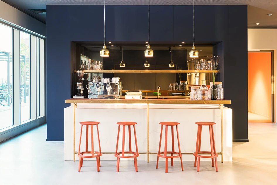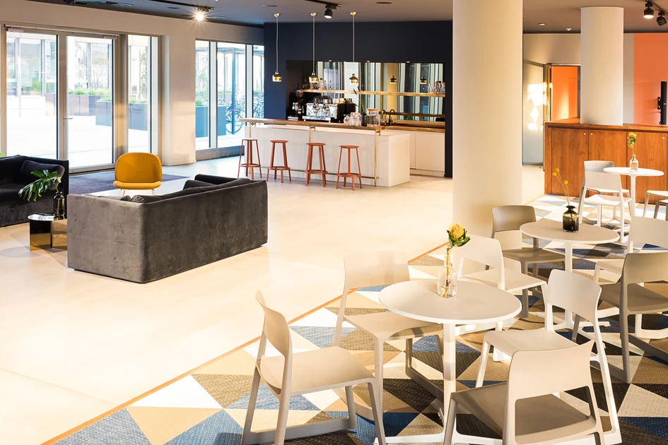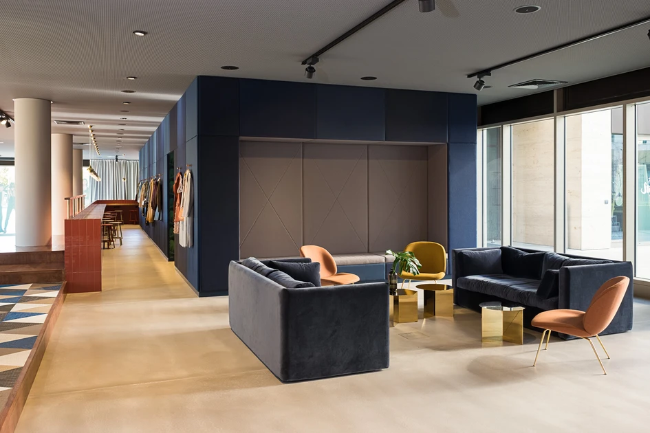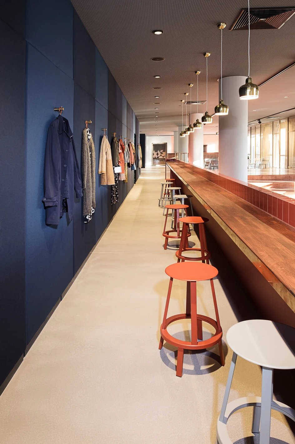 An outline as fun & challenging as the outcome: Zalando HUB, a multi-functional space where hotel lounge meets cinema, set within a split level space in a newly built office complex across from the Eastside Gallery.