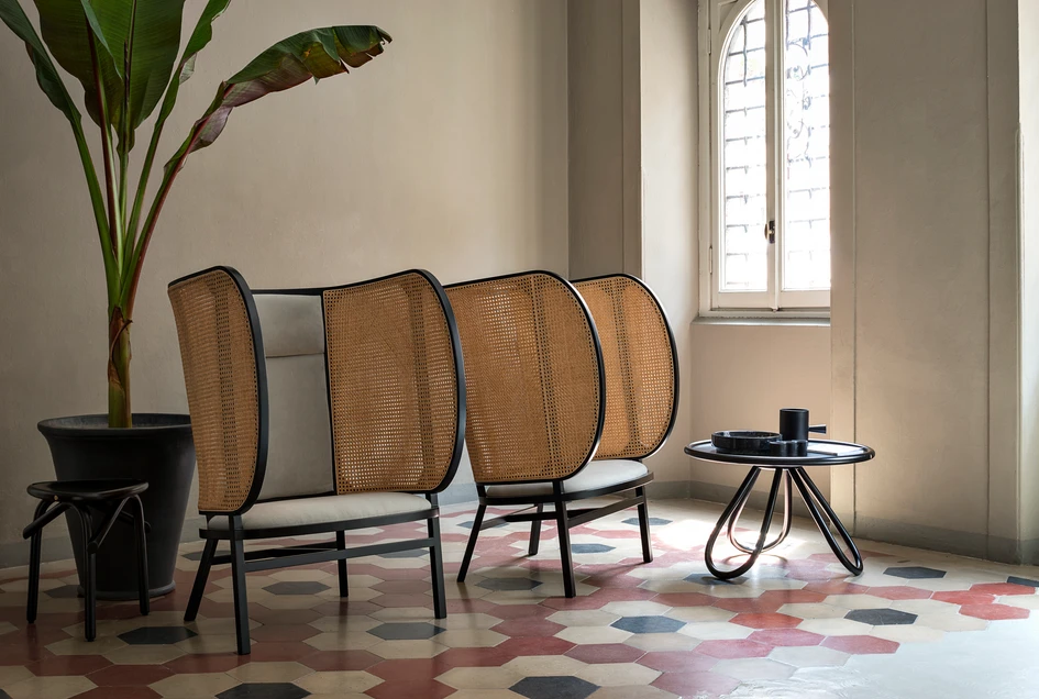 In spite of its siblings, however, the company has over time engineered its own specific DNA. It has succeeded in establishing an enviable roster of creative partnerships with the likes of Michele De Lucchi, Front, Philippe Nigro, Nigel Coates, Nendo, Michael Anastassiades, and GamFratesi, which leverage the traditional manufacturing process to innovative effect. Contemporary designs that push back the production limits of steambending, while expanding its formal lexicon. Take its Targa sofa or Hideout armchair, as much at home at home, as it were, as in contract settings. Or its expressive N. 200 chair. Diverse designs that employ the same discourse of woven cane and silhouette-defining bentwood.