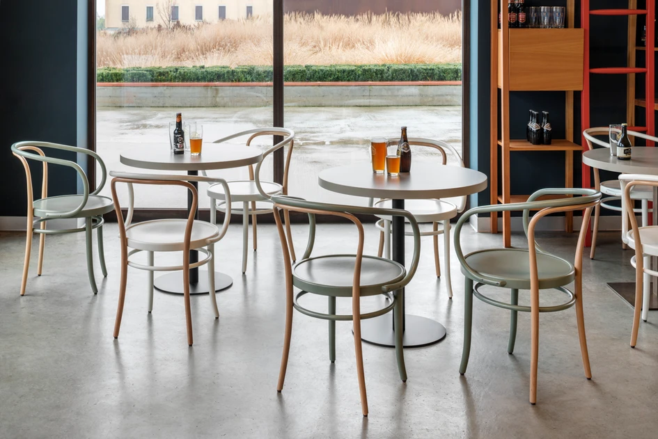 Such hospitality projects speak, naturally, to the bentwood-in-bistros tradition, which harks back to the end of the 19th century and Vienna’s Café Museum and Hotel Sacher. But it’s not all about sipping and dining. The 100-year-old-plus QC Terme San Pellegrino thermal baths, for example, a few miles outside the Italian city of Bergamo, are also graced with GTV pieces. Here, the recently restored, wood-panelled and fresco-filled spaces have been staged with a judicious selection of almost 300 of the manufacturer’s chairs, armchairs, sofas and tables.