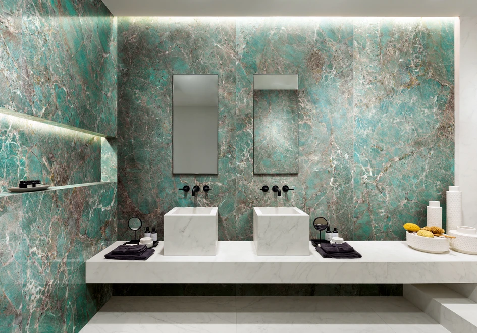 The large-scale sheets are available in various shapes, including the perfectly square 160x160cm tiles in addition to slabs in several rectangular variations, from the long and narrow to the wide and long. Viewed vertically, the biggest sheet is around twice the height of an average person.