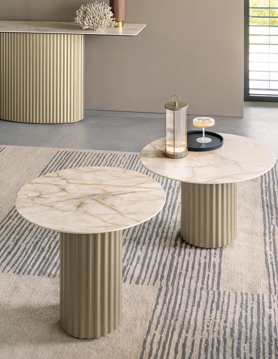 Compact living spaces are not forgotten. The Enea Round and Square models now come in an L140 cm version, maintaining the same bevelled ceramic on glass construction. Even the Enea Coffee Tables share the ribbed character, available in Big and Small and fully customisable across base and top.