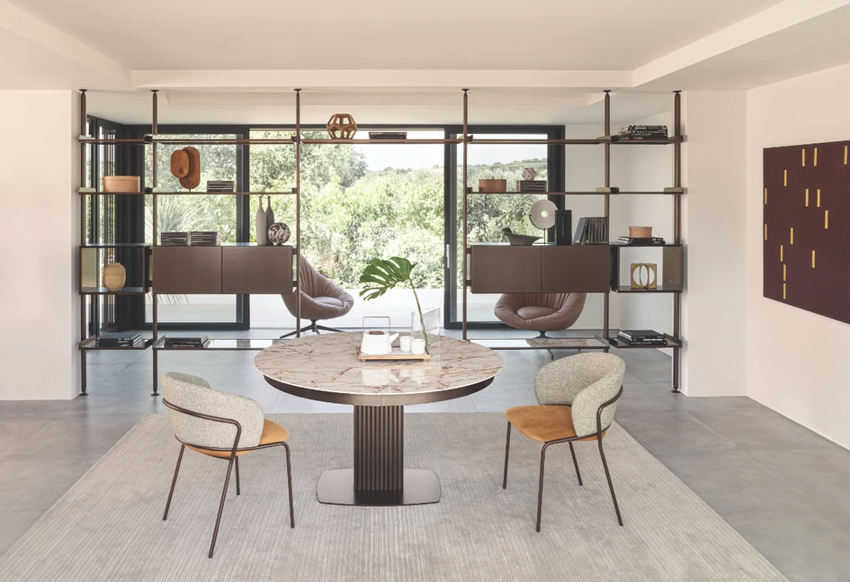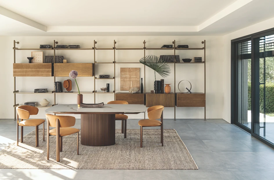 No piece embodies this philosophy more boldly than the Onda Table. Its name gives the game away. The base undulates with an elegant ripple, a soft sculptural gesture locked in metal. It’s a registered design and unmistakably the kind of object you build a room around. The minimalist structure frames the base like an artwork, with customisable finishes that lean into the richness of hand brushed metals including brass, titanium, cobalt and ruby. If paint is more your palette, graphite, pearly champagne and bronze offer subtler interpretations.The tops keep pace with this level of refinement. Ceramic layered onto 12 mm glass appears in shapes ranging from round to barrel, available in more than twenty glossy and matt finishes. For those who entertain in both intimate and expansive modes, the Onda also comes with an extendable top. The Onda Round and Square versions follow suit, offered in three sizes with both fixed and extendable configurations. To complete the ensemble, the Onda Suspended Sideboard arrives in bronze lacquered wood. Its geometric inspiration and deep grooves echo the table’s aesthetic, creating a play of light and shade that turns even storage into an expressive design feature.