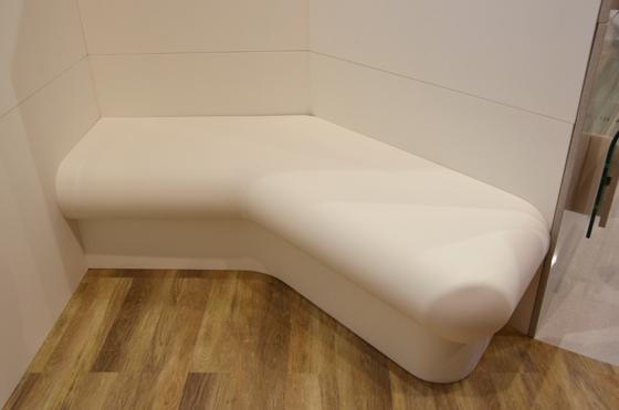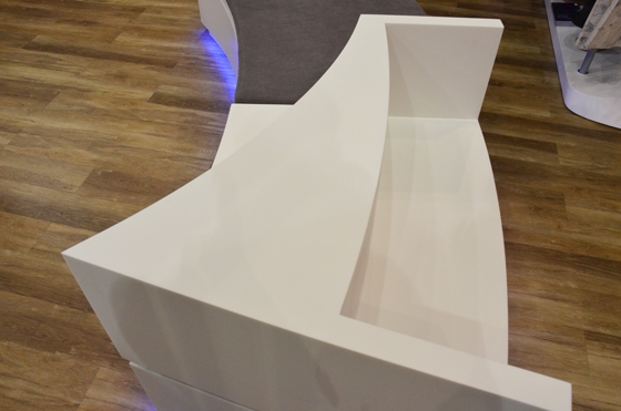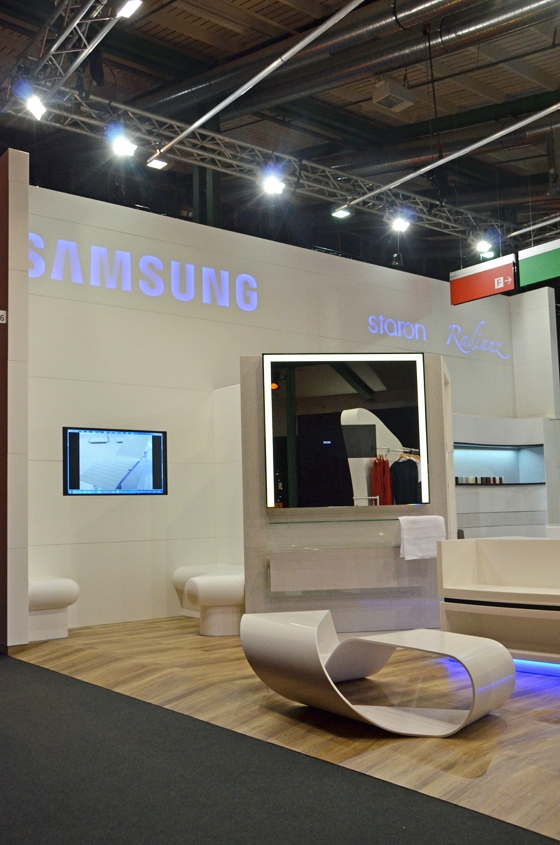 Available in over 80 colours, white STARON® was chosen to construct the landscape of Lotte Chemical Deutschland’s exhibition stand, one where clean, contemporary line demonstrated convincingly the premium value of the product in both visual and tactile terms. At first glance, these concept spaces – a reception desk, a wellness area, four- and five-star bathrooms, and a bedroom, which also included examples of furniture and doors made of STARON® – appeared beautifully pared-down, but a closer look was to reveal how, without compromising their purity of expression, a raft of innovative design details and leading-edge technologies have been built into them.