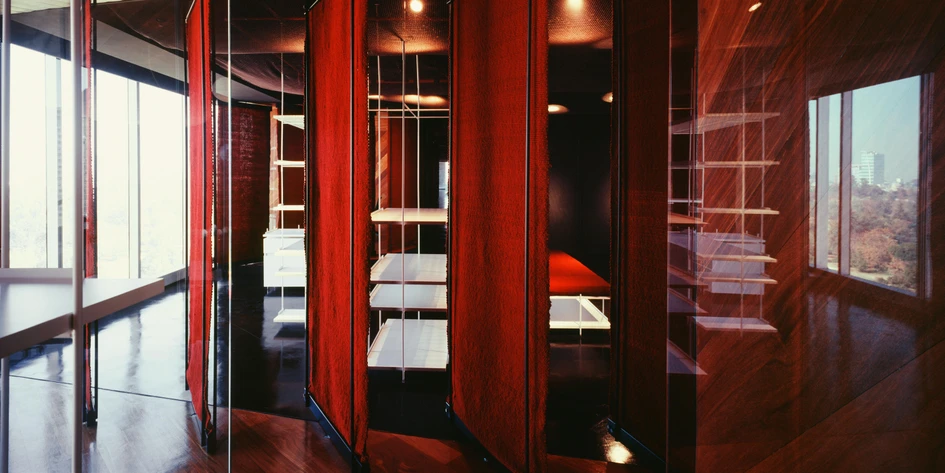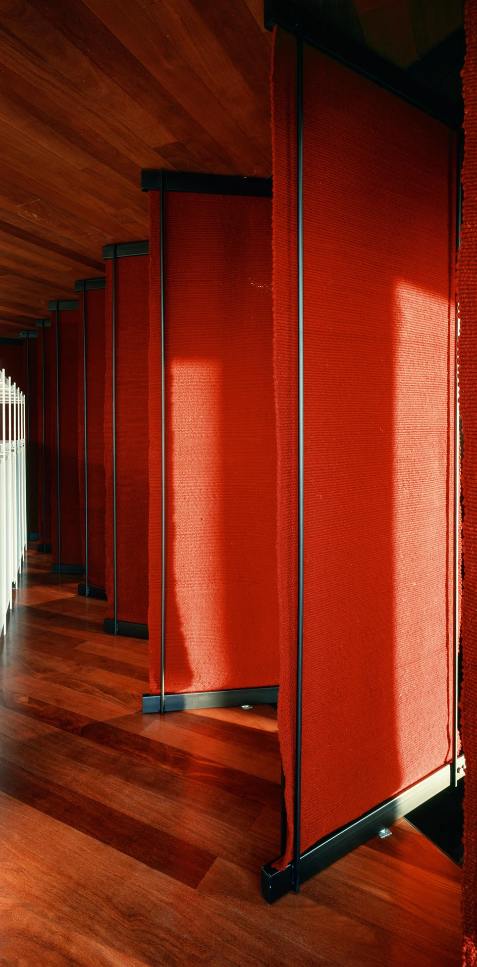 In Santiago, Chile, DBAA – Diego Baraona Arquitectos y Asociados – have designed Office Space, using monochromatic wool tapestries mounted within pivoting metal frames, as a way to separate the meeting rooms from the open-plan desks used by the office workers. The crimson textile louvres act as changeable-semi permeable membranes, allowing views across the office to the outside, while offering the desired degree of visual and acoustic privacy.