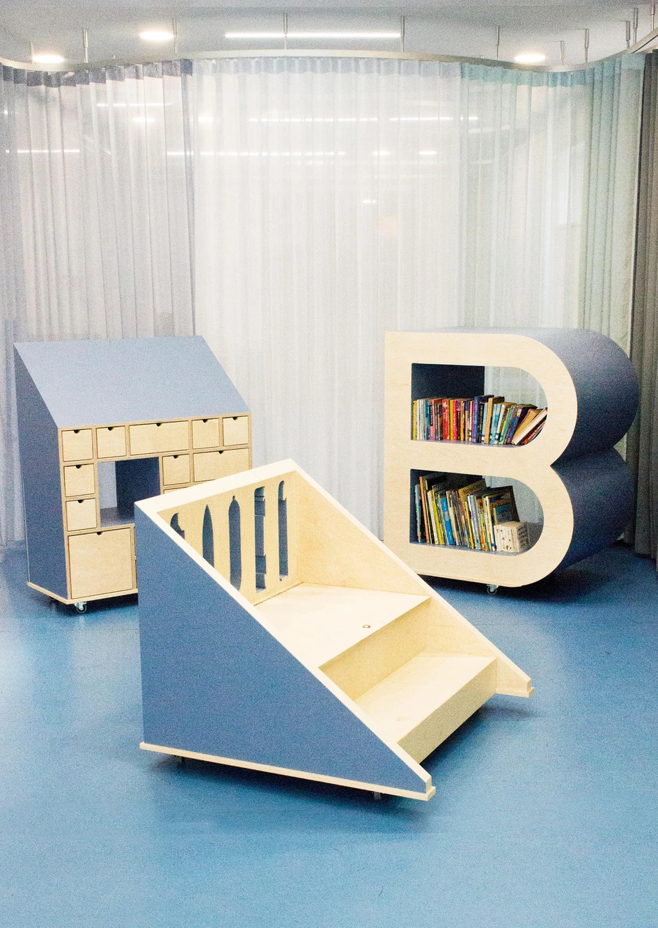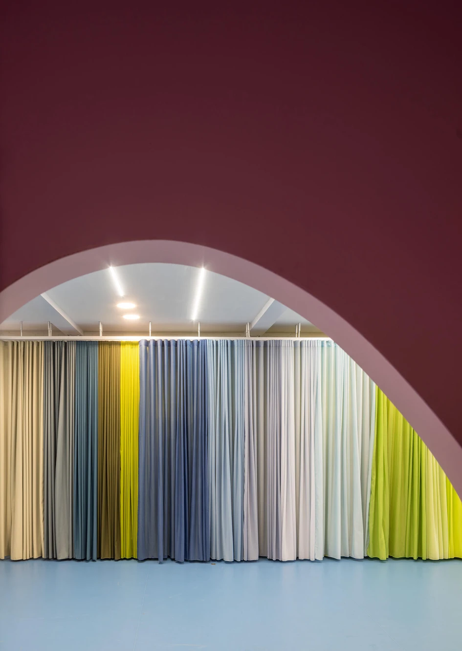 London's Aberrant Architecture also uses textiles to create a flexible space – this time in Rosemary Works, a local independent elementary school in North London. Situated within an old factory, the architects have designed a series of rails from which they suspended multi-coloured curtains that form a central multi-purpose space. Together with moveable furniture, the hall now acts as a breakfast club, a canteen, as well as a space for assembly, events and indoor PE lessons.