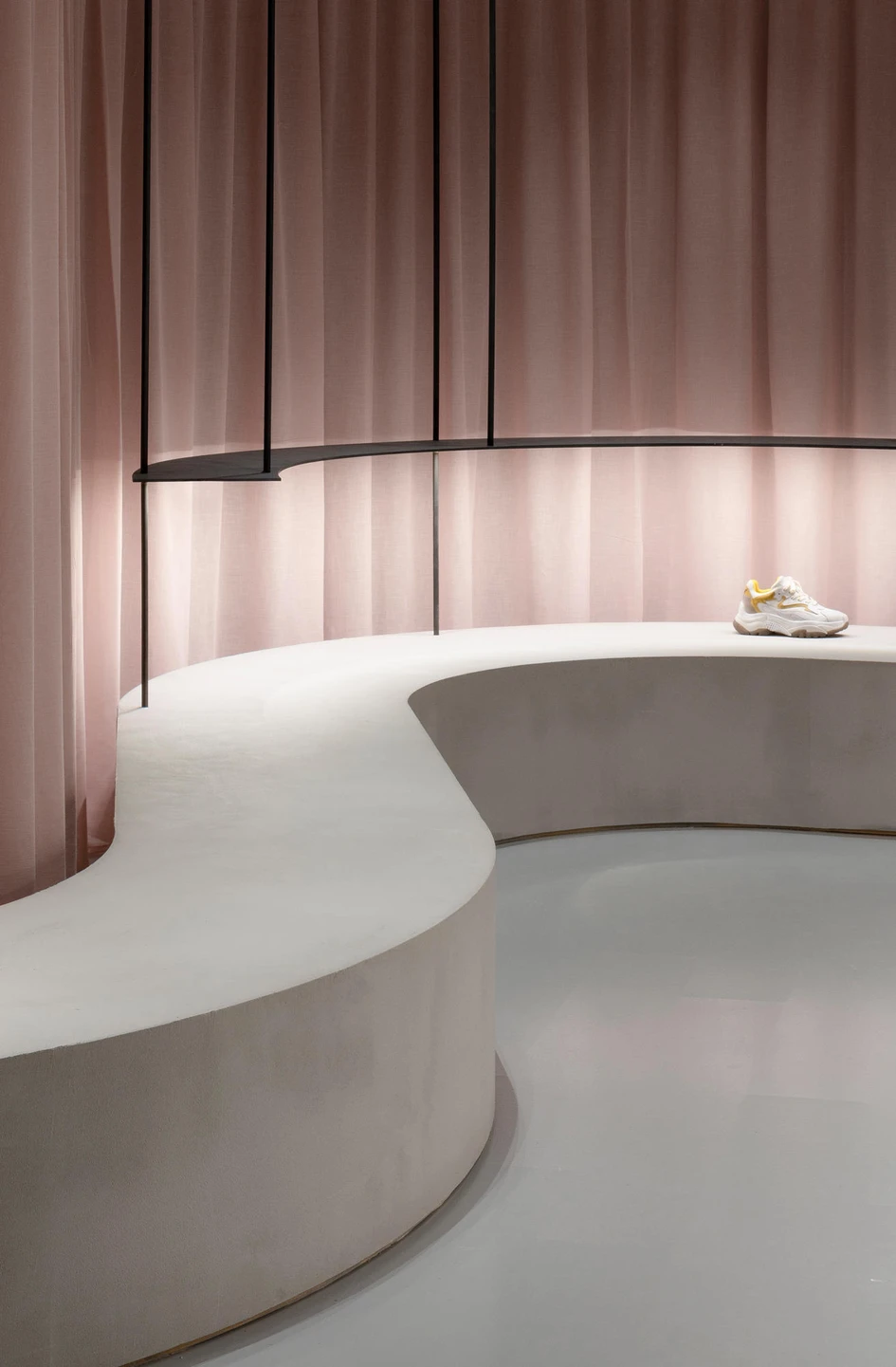 Barcelona-based Francesc Rifé, for instance, uses a textile curtain to form a backdrop for the minimalist retail space for shoe brand ASH in Mallorca. Here, the soft, dusky pink sheer curtain contrasts with the hard, light grey concrete floor and slender, suspended metal shelves to create a beguiling store which draws in passers-by, while elevating the products on display.