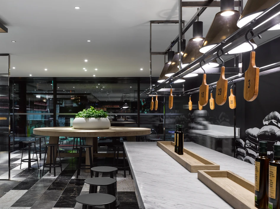 Central-hung objects aren’t exclusive to garages, of course. Bucking the trend of super minimalist kitchens, hanging pan racks are still a popular design feature for those looking to show off shiny panware in the maximalist decor of a country kitchen. The Masseria pizzeria in Toronto, Canada, for example, makes the gimmicky but also functional choice to display customer order boards on hanging utensil racks.The practice of hanging glassware upside down reduces the opportunity for resting dust to form