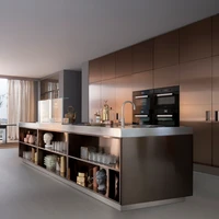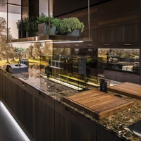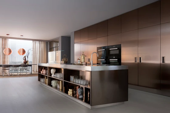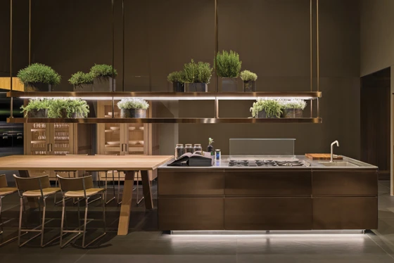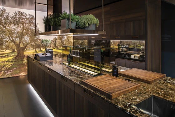 The culmination of Arclinea’s evolution and considerable know-how could be truly appreciated this year at its Eurocucina stand at the Salone del Mobile in Milan. Here, its new kitchen Principia, created by Citterio, could be seen in all its glory. Its highly original design juxtaposes antique-looking rough wood with stainless-steel finishes and a technological process Arclinea is rightly renowned for PVD (physical vapour disposition), which both binds colour to stainless steel via evaporation of titanium molecules and renders the steel harder and more resistant to wear and tear. Principia features handcrafted integrated handles, 84cm-high base units on 8-cm plinths, wood larders with glass doors and the wood Opus table, used as a presentation or peninsula table. Also on display was Arclinea’s Steelia finish created using PVD in fabulously opulent shades, some rarely encountered in kitchens – bronze, champagne, stainless steel and black. Also on display was the sumptuous Vanity collection, which incorporates subtle LED lighting, black quartz and smoked oak.