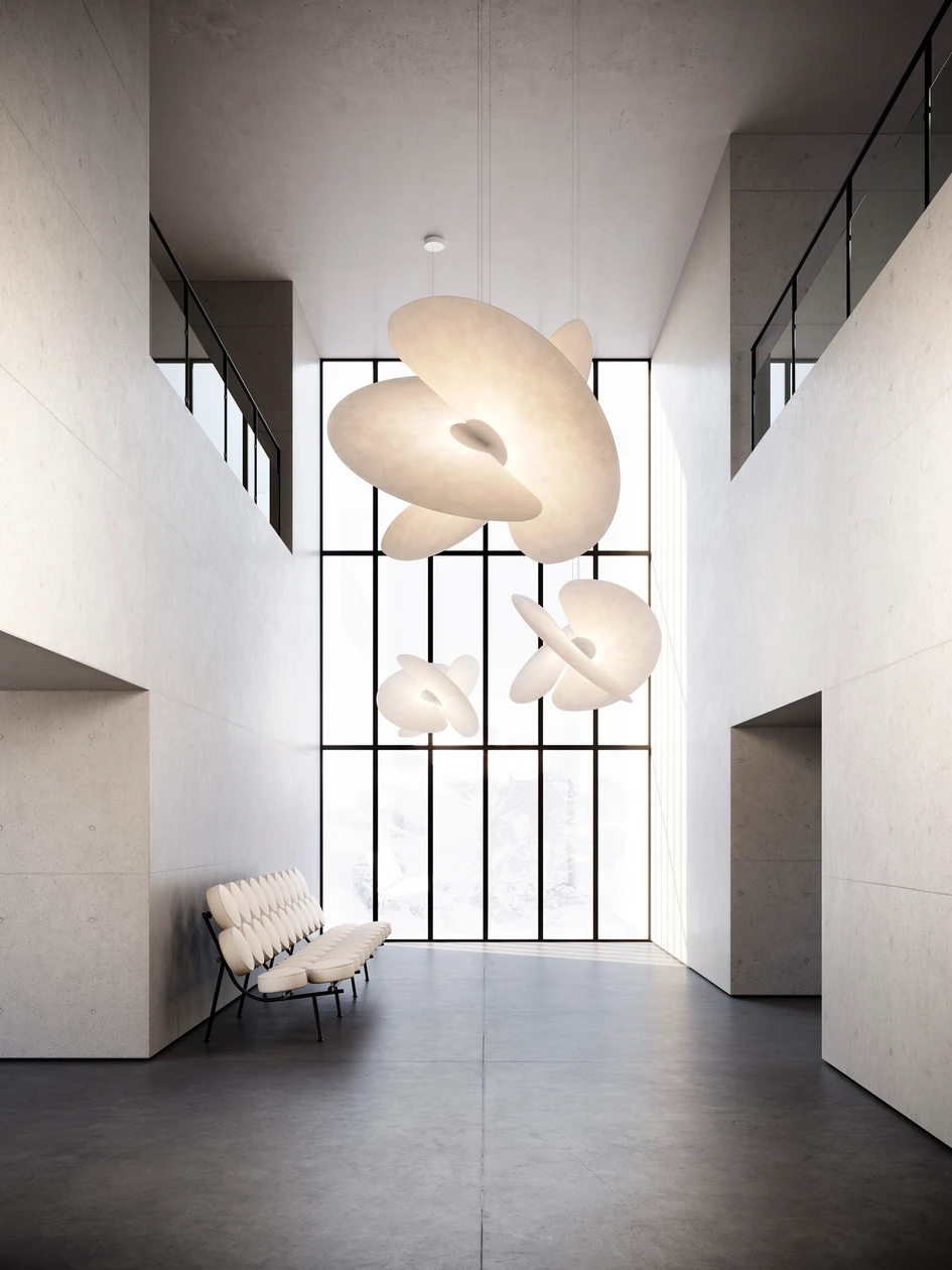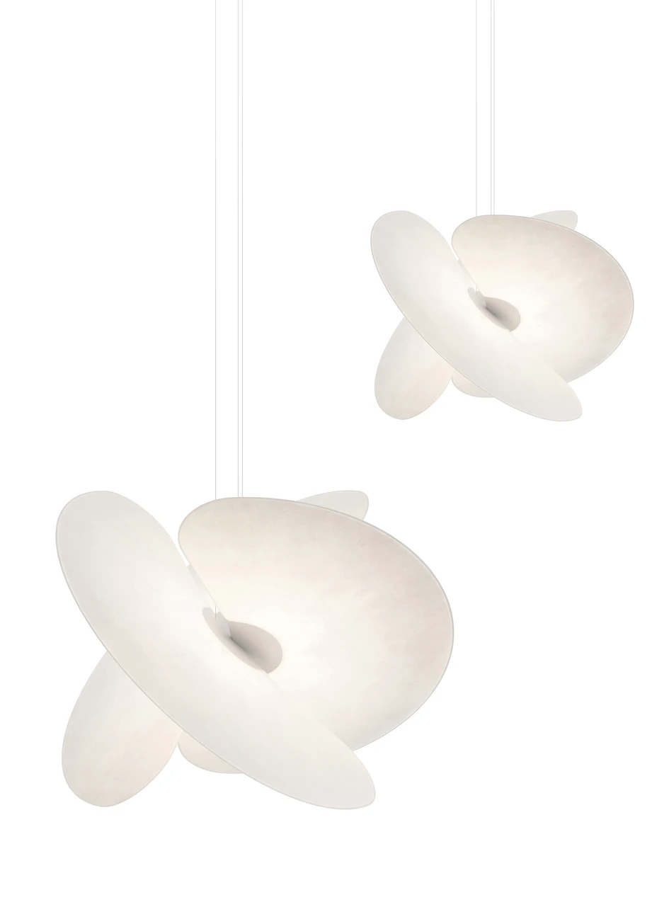 The size is impressive, yet the overall image is ethereal, like an organism floating in space. Levante (the name suggests lightness and wind, but also a clear reference to oriental aesthetics) stems from the intersection of three large fans, made in an unprecedented material for the design sector, borrowed from the world of food, with an appearance similar to rice paper, to spread light in a uniform way over surfaces.