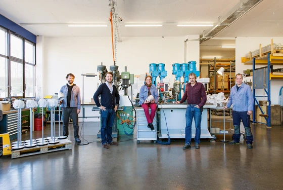 BALTENSWEILER: The independent Swiss lighting manufacturer has 65 years of expertise when it comes to producing timeless, top-quality lamps for the premium segment. And with more than 15 years of experience with LED technology to draw on, the company is an expert for consistent and innovative lighting concepts for private and office settings. ABOVE: From left to right: Lukas Niederberger (head of design and development), Camillo E. Settele (head of sales and marketing), Karin and Gabriel Baltensweiler (managing directors) and Ilario Meier (workshop manager).