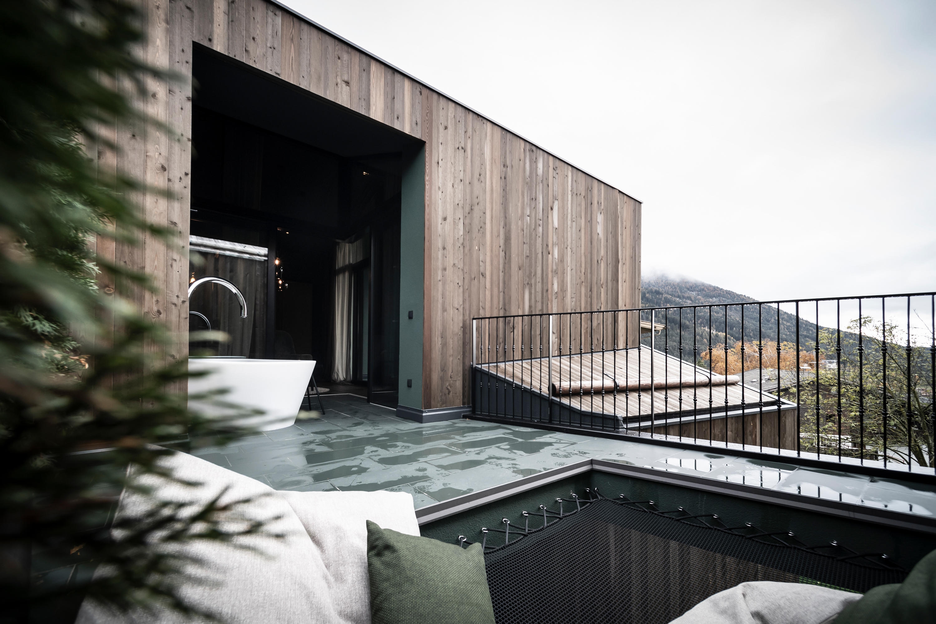 In northern Italy, noa* network of architecture has designed a hotel that reimagines the bath with a view. Their Floris Hotel consists of a number of house-shaped volumes stacked and staggered on top of one another and raised on stilts. To safeguard the guests' privacy, the architects have created a glazed loggia on the side of each individual suite featuring a free-standing bathtub offering views of the inside as well as oblique views across the Alps.