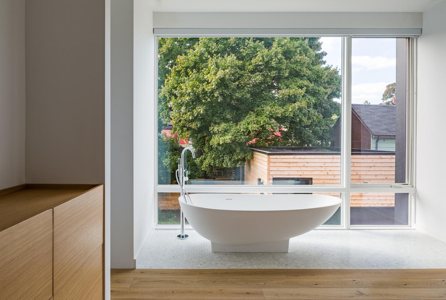 In the suburbs of Toronto, StudioAC's Beaconsfield Residence hides its unexpected spatial gymnastics behind a rather ordinary Victorian facade. The open living area with a double-height central space and floating timber volumes leads up to two bedrooms on the first floor. Facing the garden, the master bedroom features a separate bathroom to the side, providing privacy for the owners' daily toilette, while a free-standing bath with a view offers a compelling place to relax and unwind.