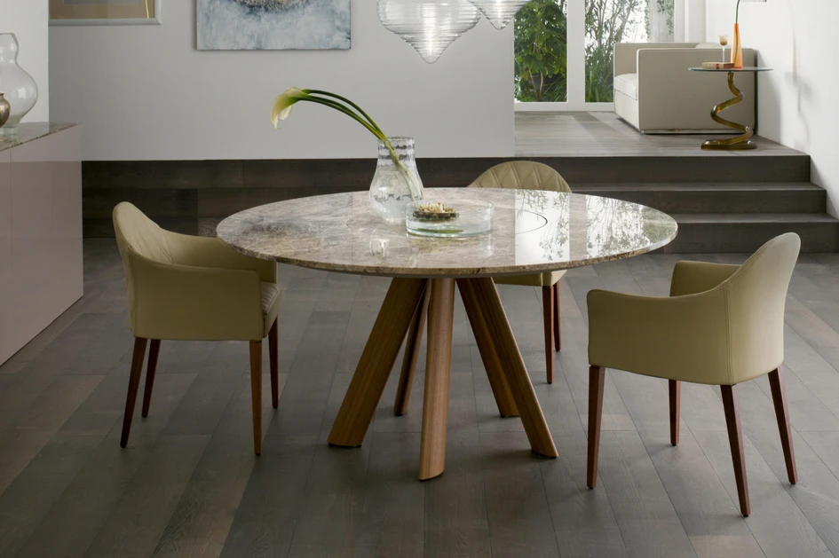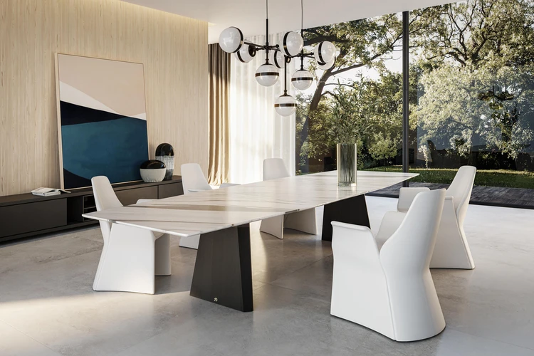 As well as fitting in with a dining space’s two-dimensional layout, the wide variety of optional dining table materials makes meeting the brief of a moodboard easy. Solid wood tables like the Stammtisch table from Quodes, for example, provide soft, natural tones for an effortless Scandi style, or the engaging patterns presented on solid wood tabletops like Rimadesio’s Manta table let nature do the talking.