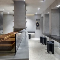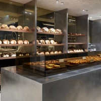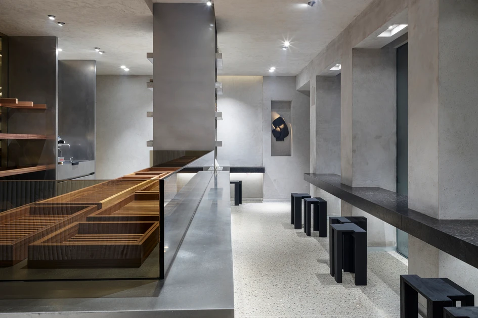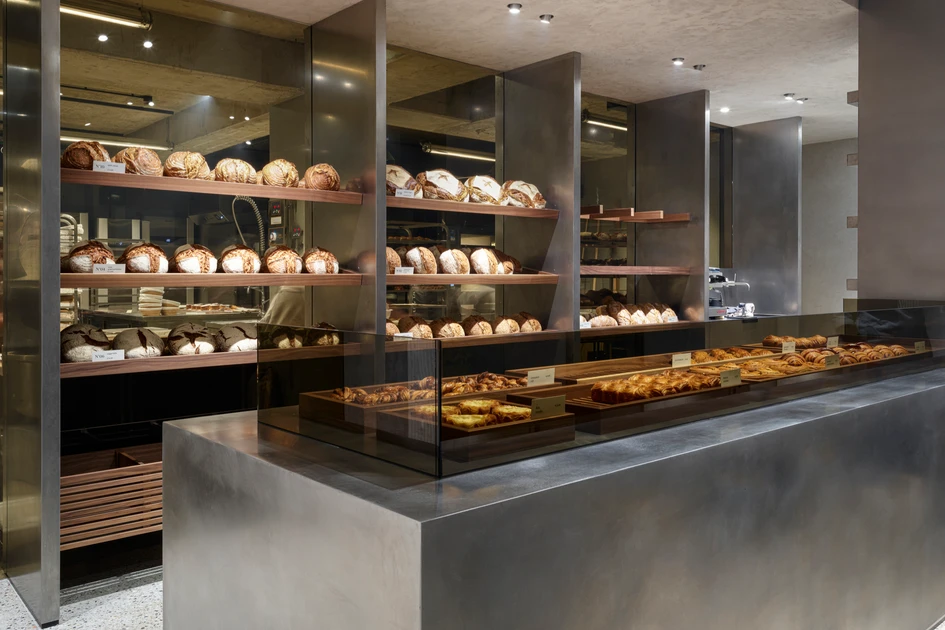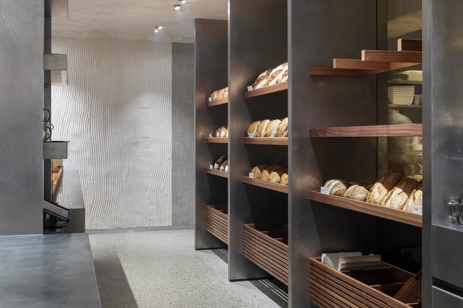 When master Belgian chocolatier Joost Arijs opened a bakery and viennoiserie to serve Ghent’s most discerning sweet-toothed clientele, he chose the laminated luxury of the pastry treats as his star attraction. In partnership with Glenn Sestig Architects, The Bakery features ‘functionalist and minimalist design,’ explain the architects, handing ‘a leading role to the product in a visible baker’s studio.’The bakery, in fact, uses the same honest design feature employed by fast-food restaurants, presenting racks of freshly-prepared loaves to serve as a backdrop behind the service counter, where an array of viennoiserie treasures are laid out in walnut trays in front. The contrasting combination of the surface materials of natural stone and brushed stainless steel, along with the warmth of the walnut trays and shelving creates a ‘fascinating contrast between architecture and craftsmanship,’ describe the architects, with austere materials on one hand, and the warm, golden hue of freshly-baked bread on the other.