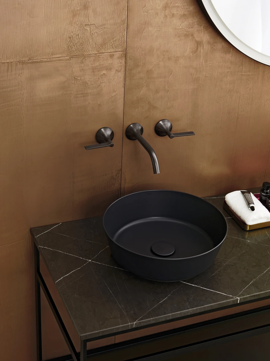 Work.Frameˣ is complemented by a wide range of thin-walled steel sit-on basins in a wide range of different sizes, shapes, surfaces and colours. For example: The Scopio SB CO375 dish basin in matt black.