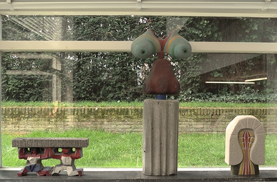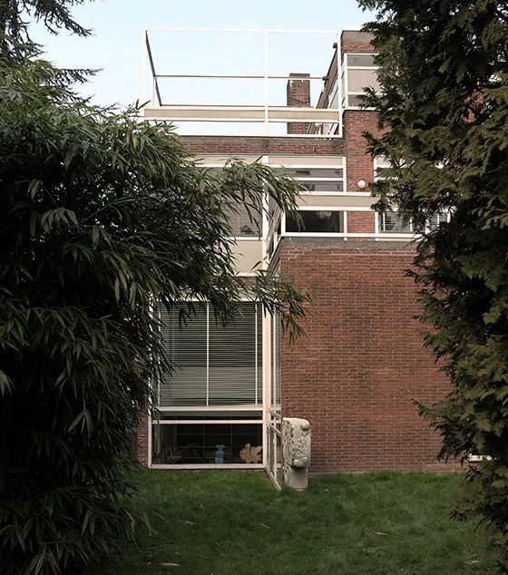Meanwhile, Braem also built many private residences, including his own Antwerp home and studio. Built in 1958 on the city outskirts, the house, a rectangular box made of bricks, glass and steel, stands at the end of a line of family row houses. While the street facade of the house is a plain, simple wall of bricks and windows, the back of the house is a dynamic rectangular composition. It evokes early Soviet constructivist experiments as well as the spatial variability of Gerrit Rietveld's famous Schröder house in Utrecht, which was built according the principles of the progressive De Stijl movement. Braem's house exemplifies the fusion of several radical modernist ideas in construction and spatial ordering. It is a chameleon, a space where simple forms create an organic architecture through their unconventional spatial organisation, rather than using fluid, expressive forms.