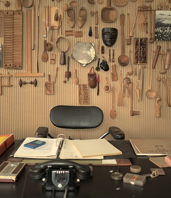 The central hallway, containing the constructivist-like staircase, leads to both the L-shaped, double-high-ceilinged studio and the living area upstairs. The studio houses a few drafting tables and a large library. Overlooking the studio is the glazed office cabin where Renaat Braem used to sit behind his desk. His workspace is framed by wall full of the rare objects he collected all over the world. The upstairs living area is an open living space where the main living room freely flows into the dining and kitchen area and the terrace above the studio. Braem's house is like a constructivist sculpture, a three-dimensional painting of radical abstract geometry. Even the small details were designed according to the 1950s constructivist movement. Most notable is the main entrance. Renaat Braem’s name and the doorbell are framed by a beautifully coloured, abstract geometric decoration while the mailbox is an elaborate functional sculpture with sliding components for letters.
