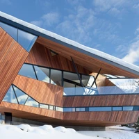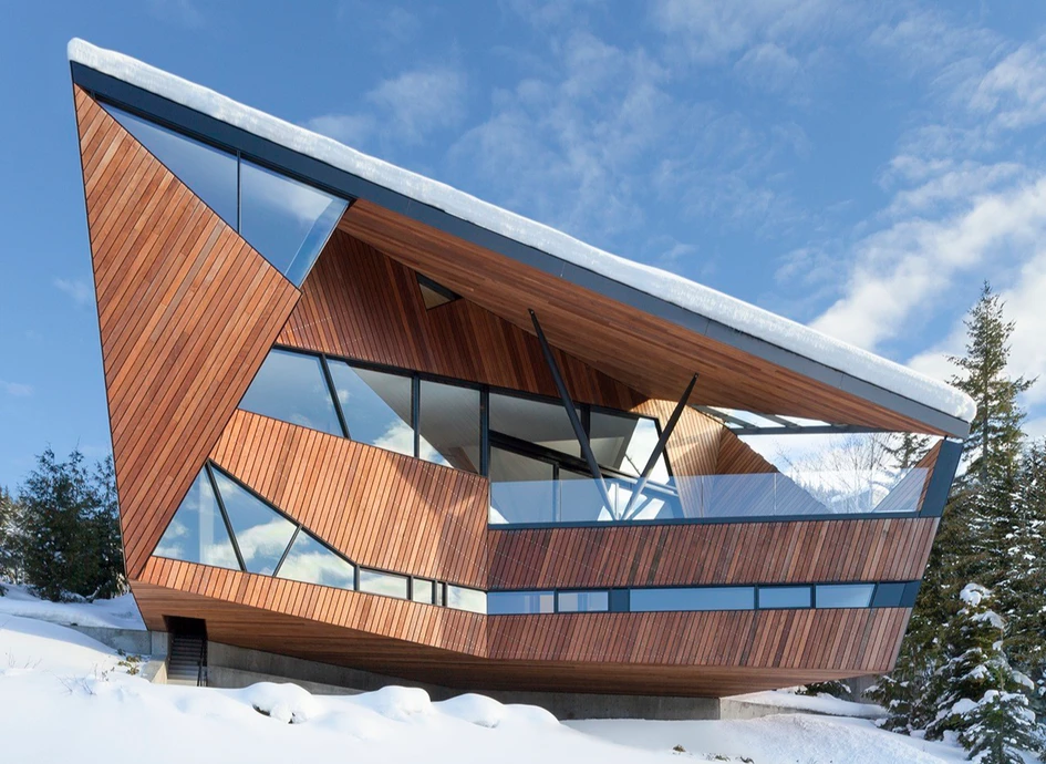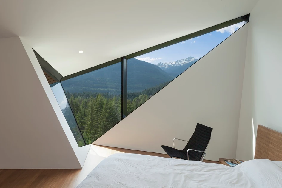 Some of the Great Primary Shapes House’s shapes are created by huge, single-entry window frames like the giant half-moon window overlooking the main living space, while others are split with frames to enable smaller or more common window sizes, like this triangular window from Solarlux, positioned above bi-fold Ecoline doors. At the Hadaway House in Whistler, Canada, meanwhile, thick layers of glazing run almost across the entire width of the property. While the windows within the strip could simply be framed in a square grid, multiple triangles and trapezoids splice them together instead, forming a randomised shatter effect.