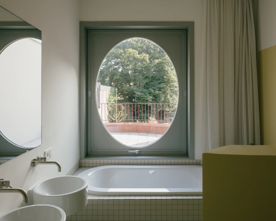 At the Windsor Castle home in Seddon, Australia, for example, a large circular window ‘fills the front facade, capturing street views like a giant eyeball,’ introduce architects Antarctica. Meanwhile, an egg-shaped window installed at the Sint Benedictus House in Mortsel, Belgium, references the curves found elsewhere in the architecture, and frames the accessible balcony like an oval-portrait photograph.